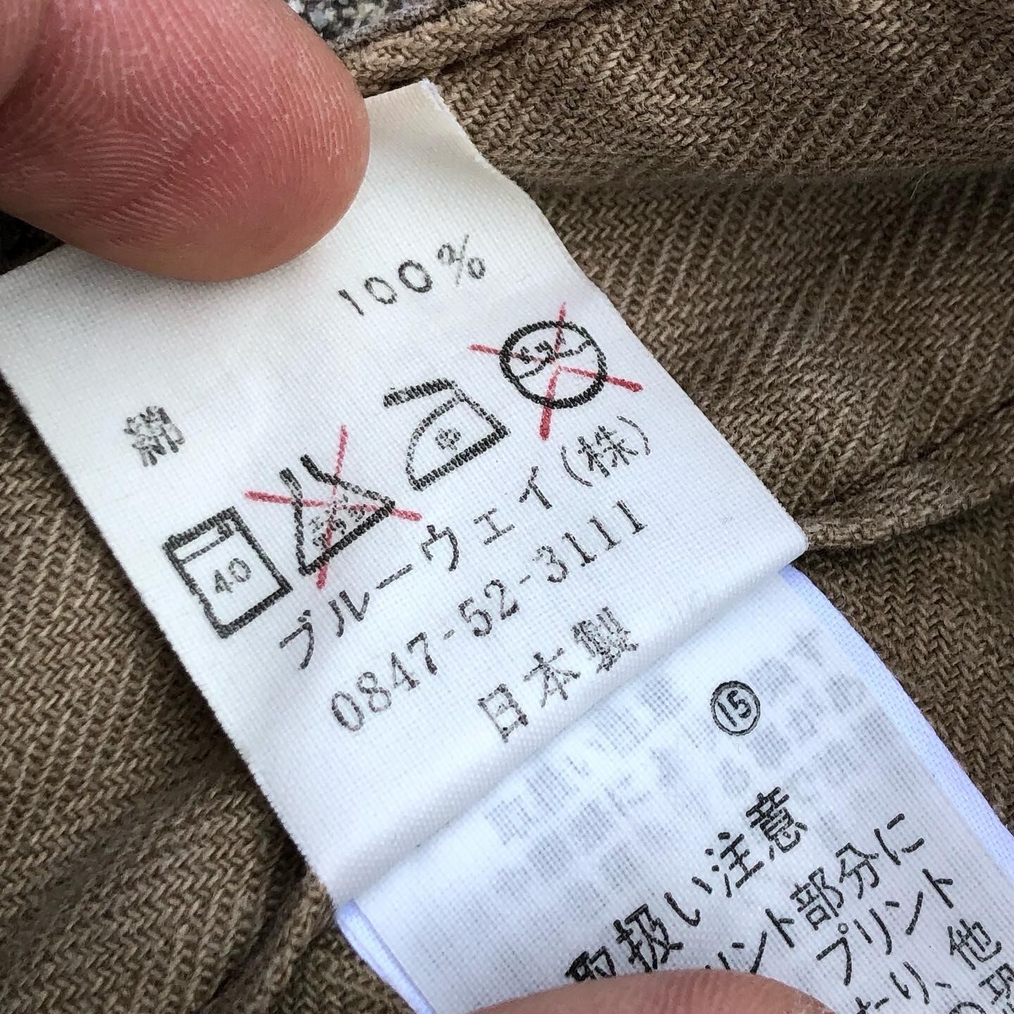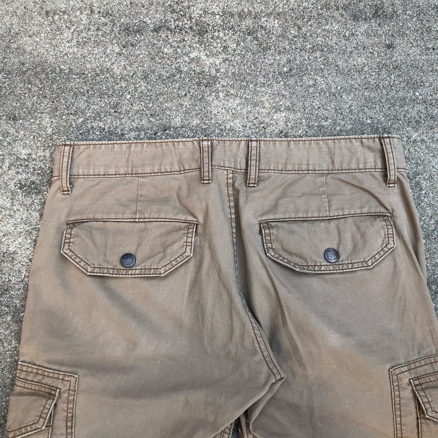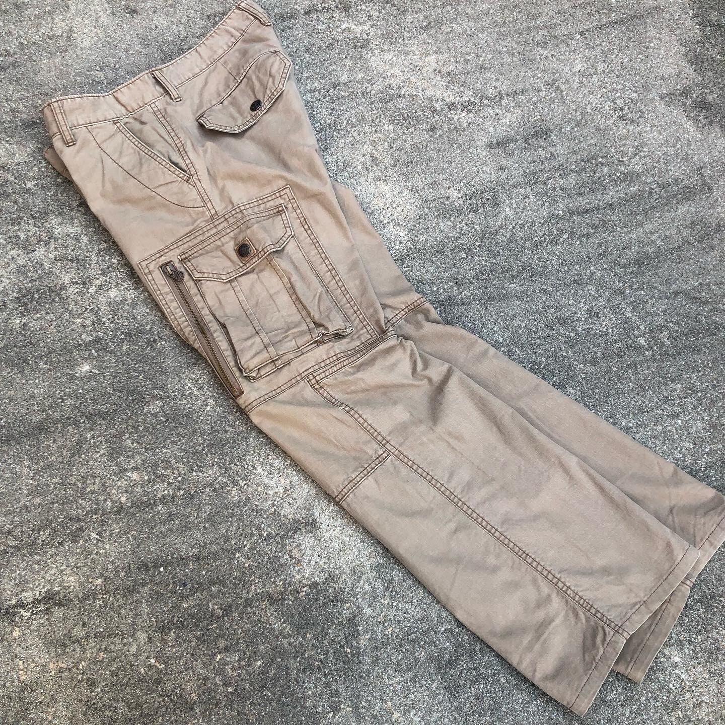 カーゴポケットを含む8ポケット仕様、特徴的なステッチ、やや末広がりなシルエット。