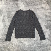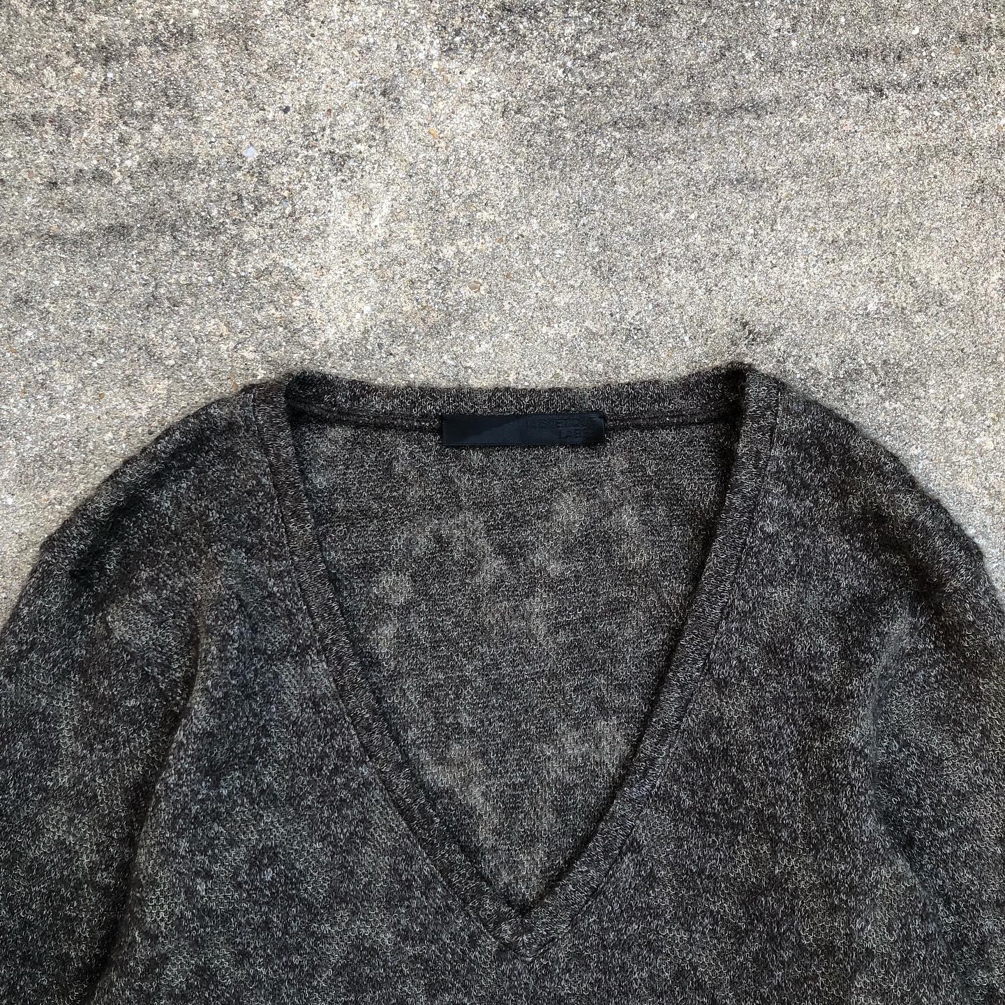 大きく開いたVネック、細身で長めなシルエット、スケスケのモヤのような総柄。