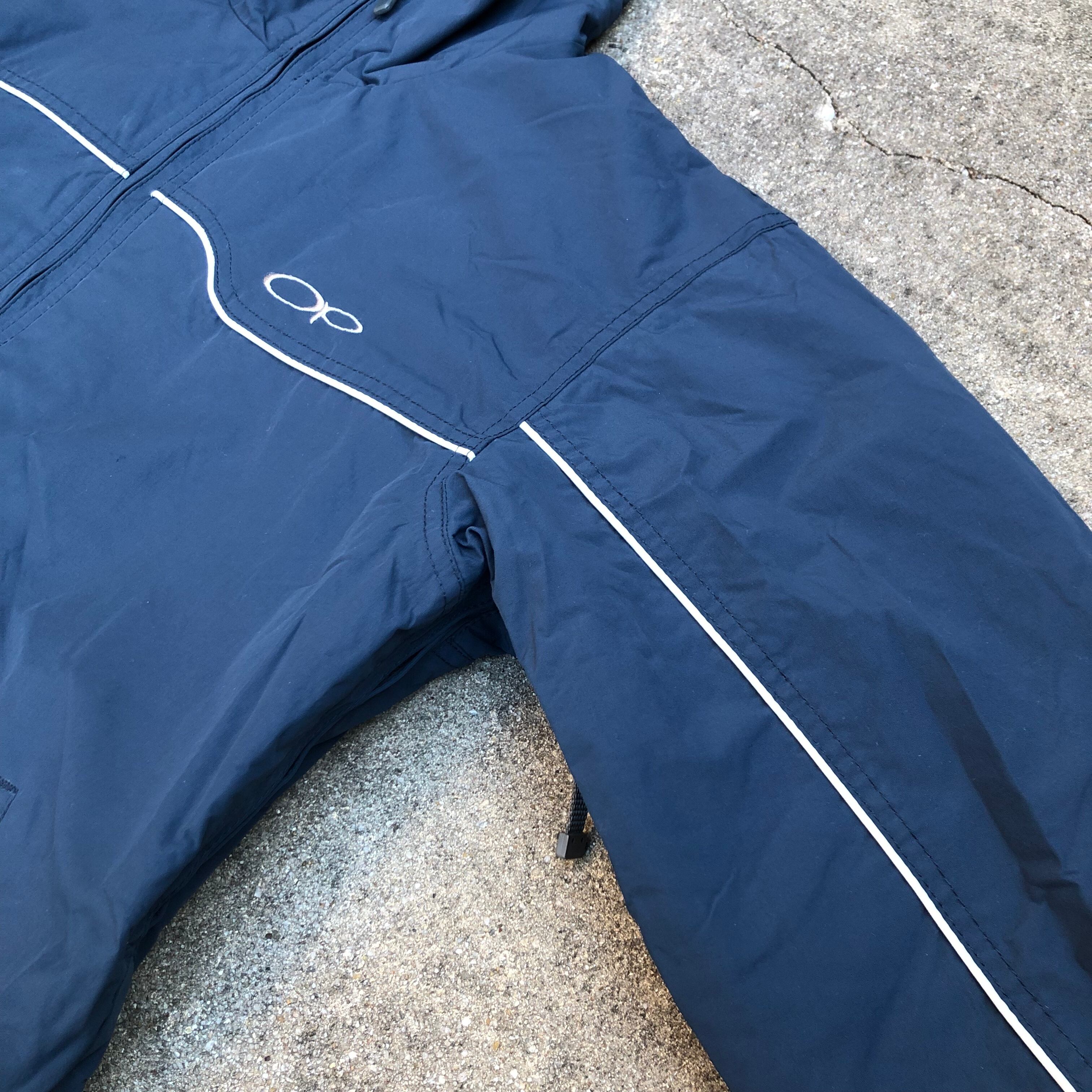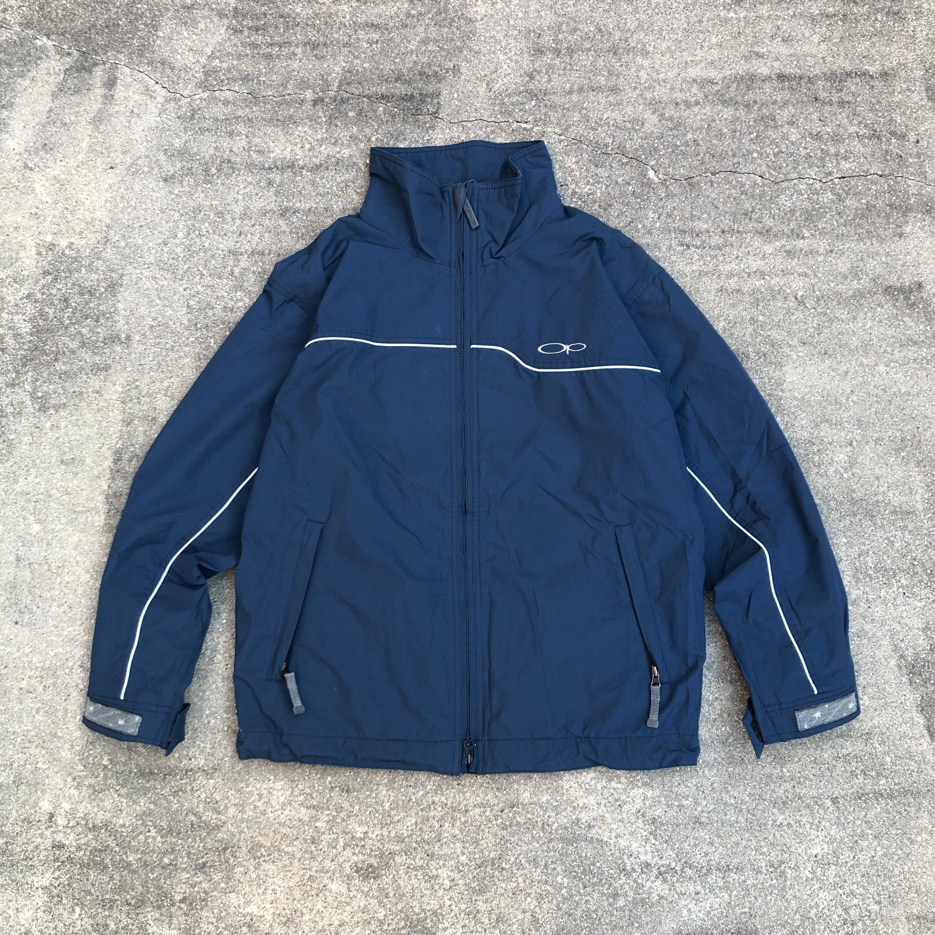 ネイビーのボディの袖からフロントバックへ走る白いライン、広め長めのスタンドカラー、ガサガサとしたナイロン生地、脇のベンチレーションなど、シンプルながらテック要素満載の一着。