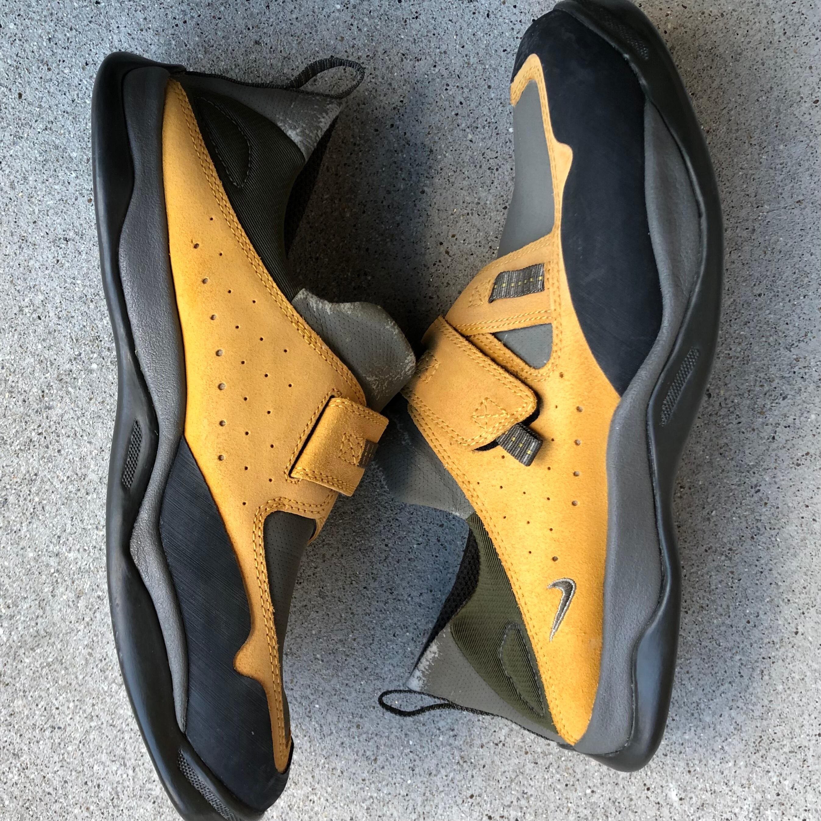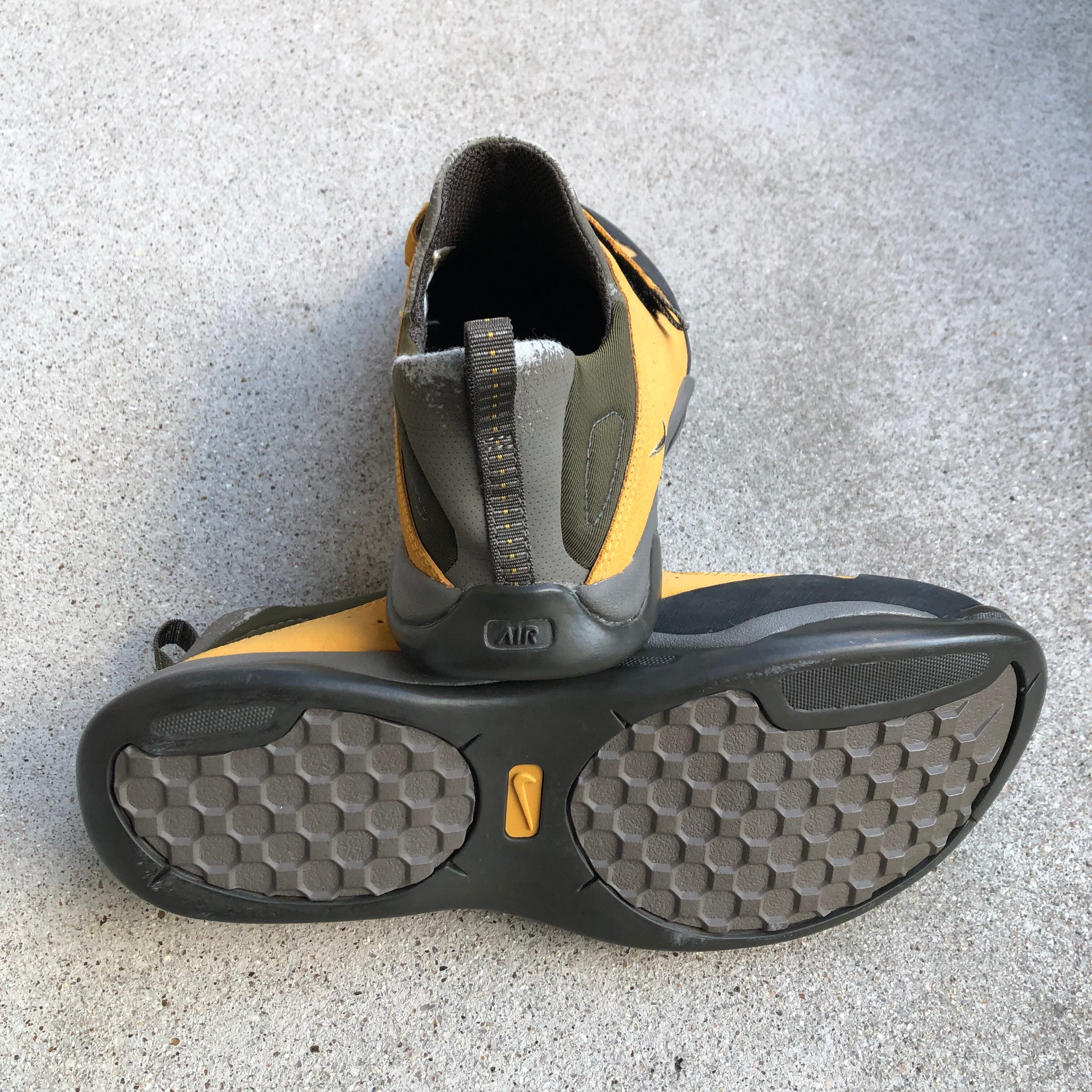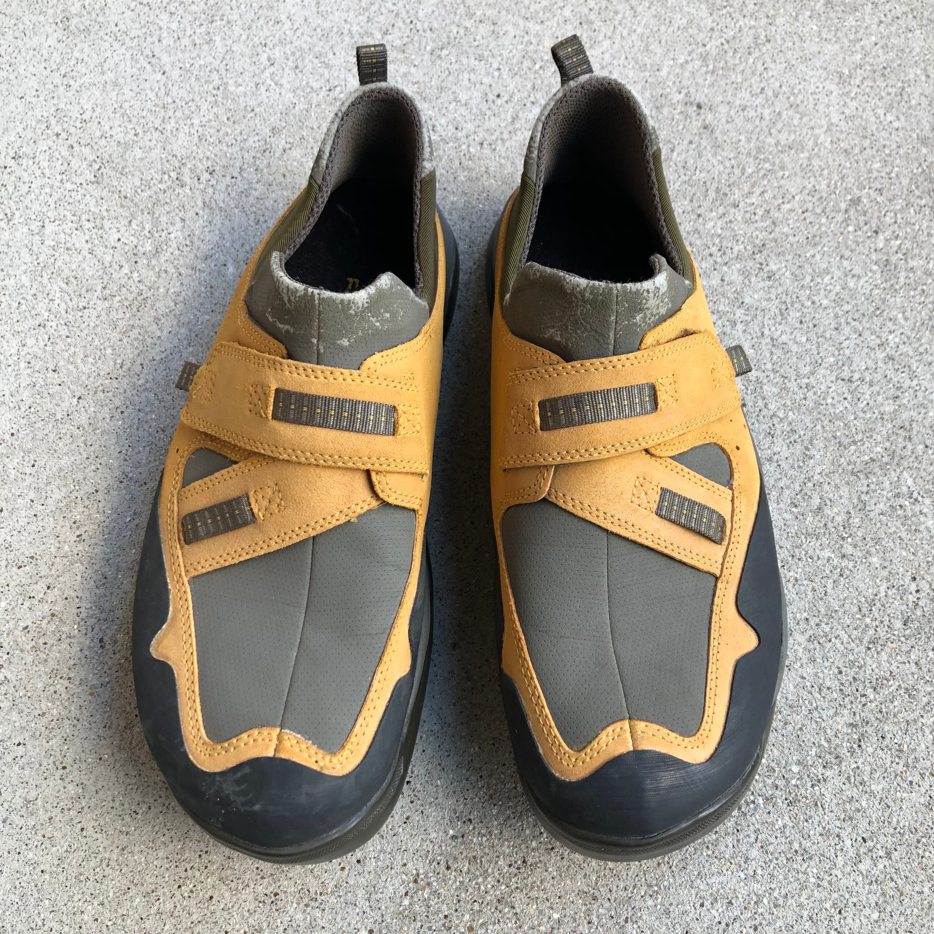 形は高めなローカットのモック、ベルクロによるアジャスト、黄みの土色とブラック、グレーのカラーリング。