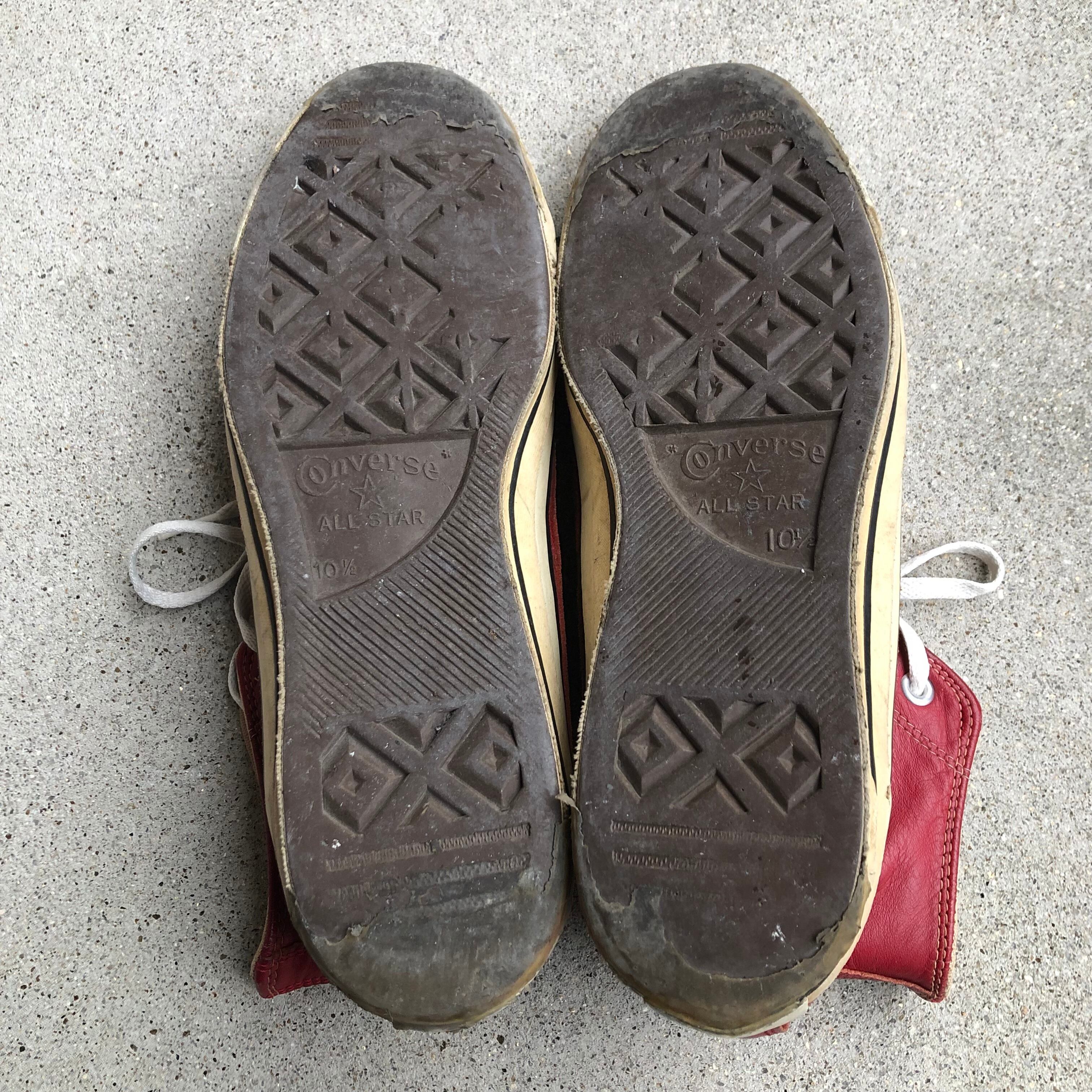 赤いレザーの上質な履き心地、最高にクタクタなエイジング、補修の施されたアウトソール。