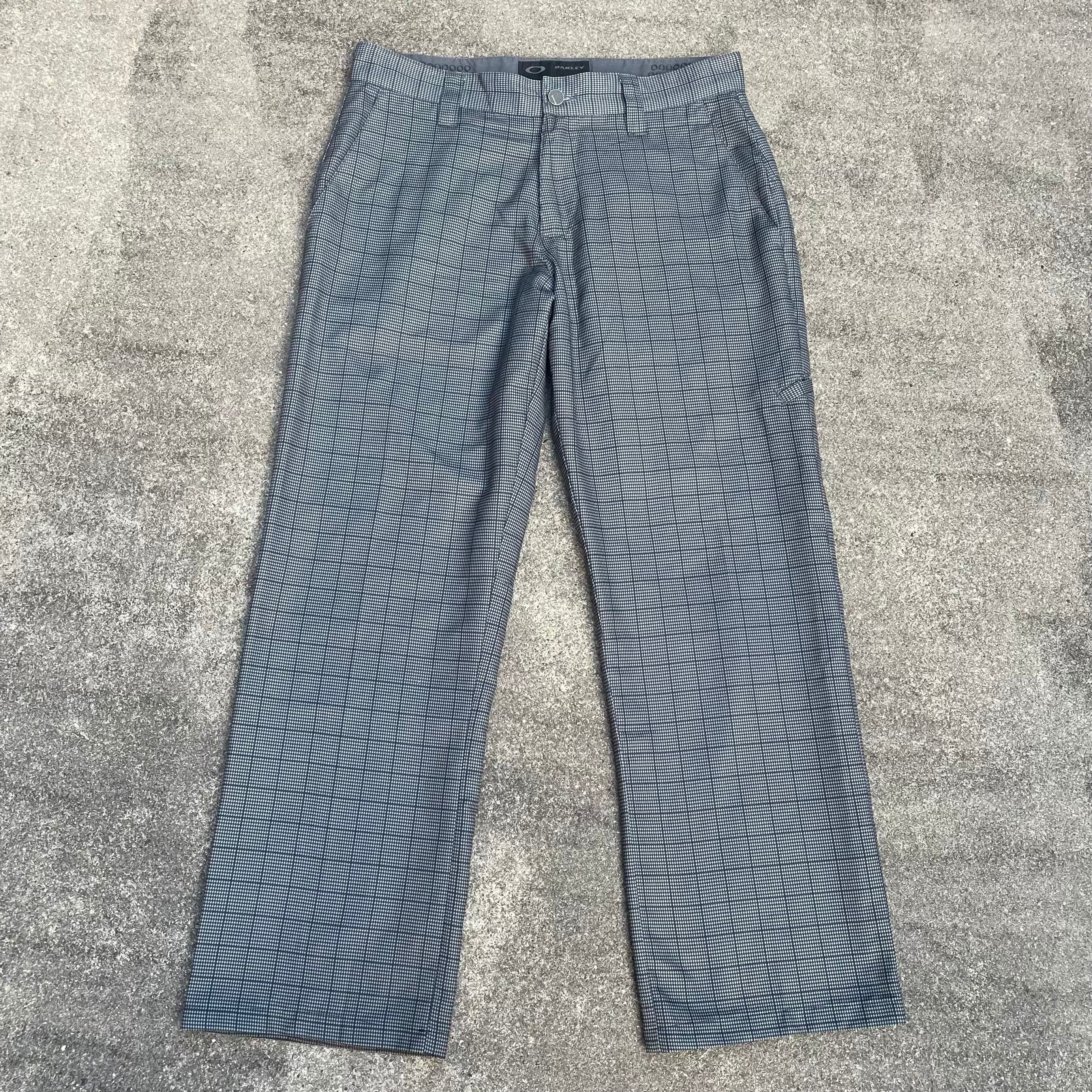小さなひし形で埋め尽くされたチェック柄、光の加減でグレーにも緑にも見えるカラー、左膝の控えめなアイコン。