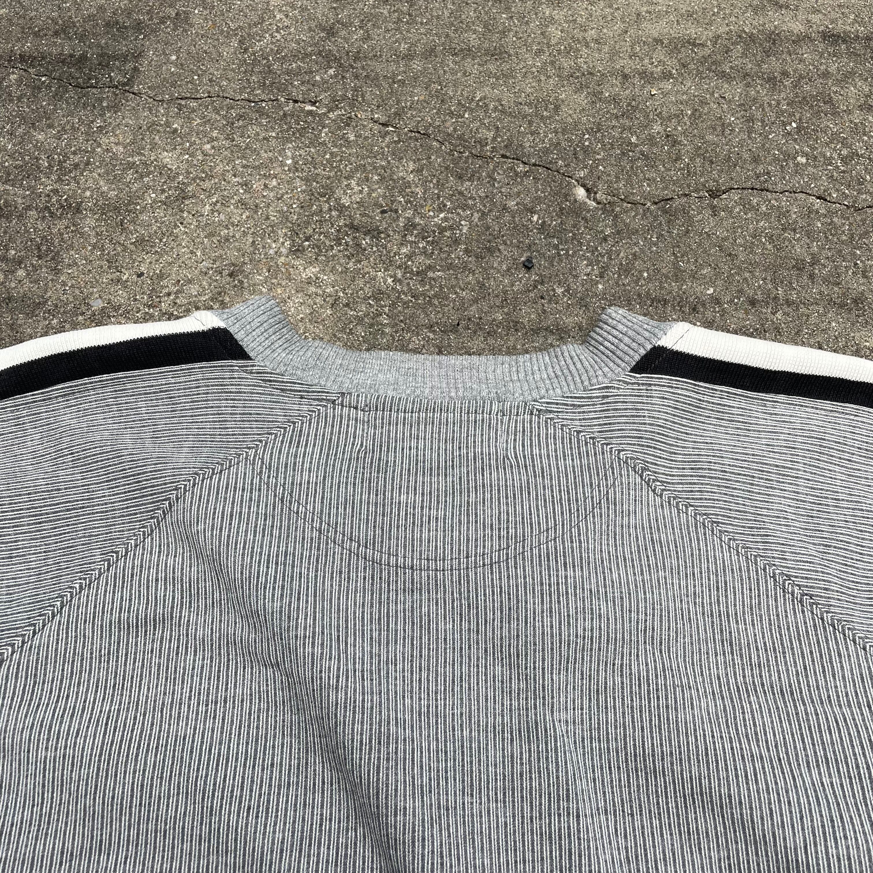 ラグランスリーブ、スッキリとした首周り、肩には白黒のライン。