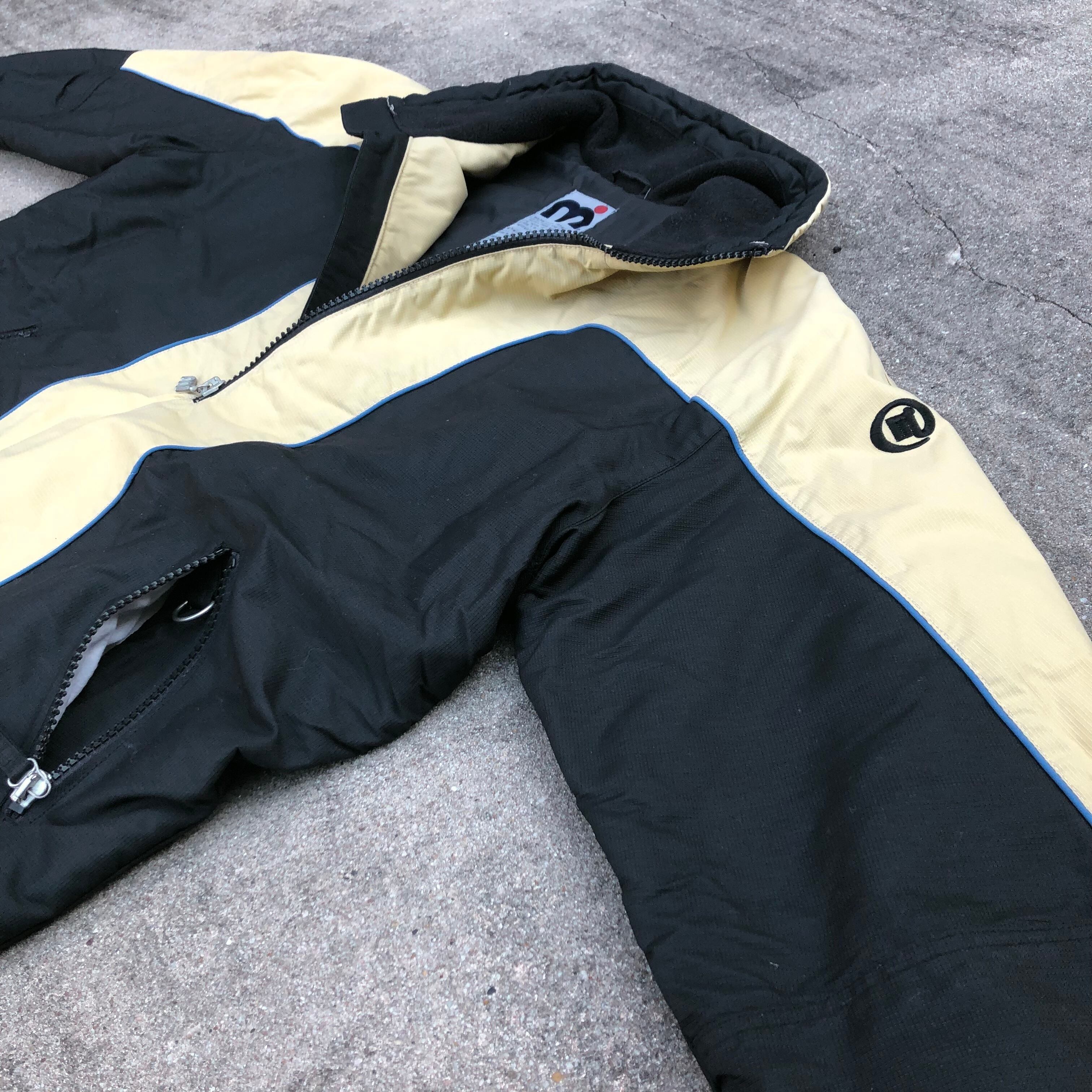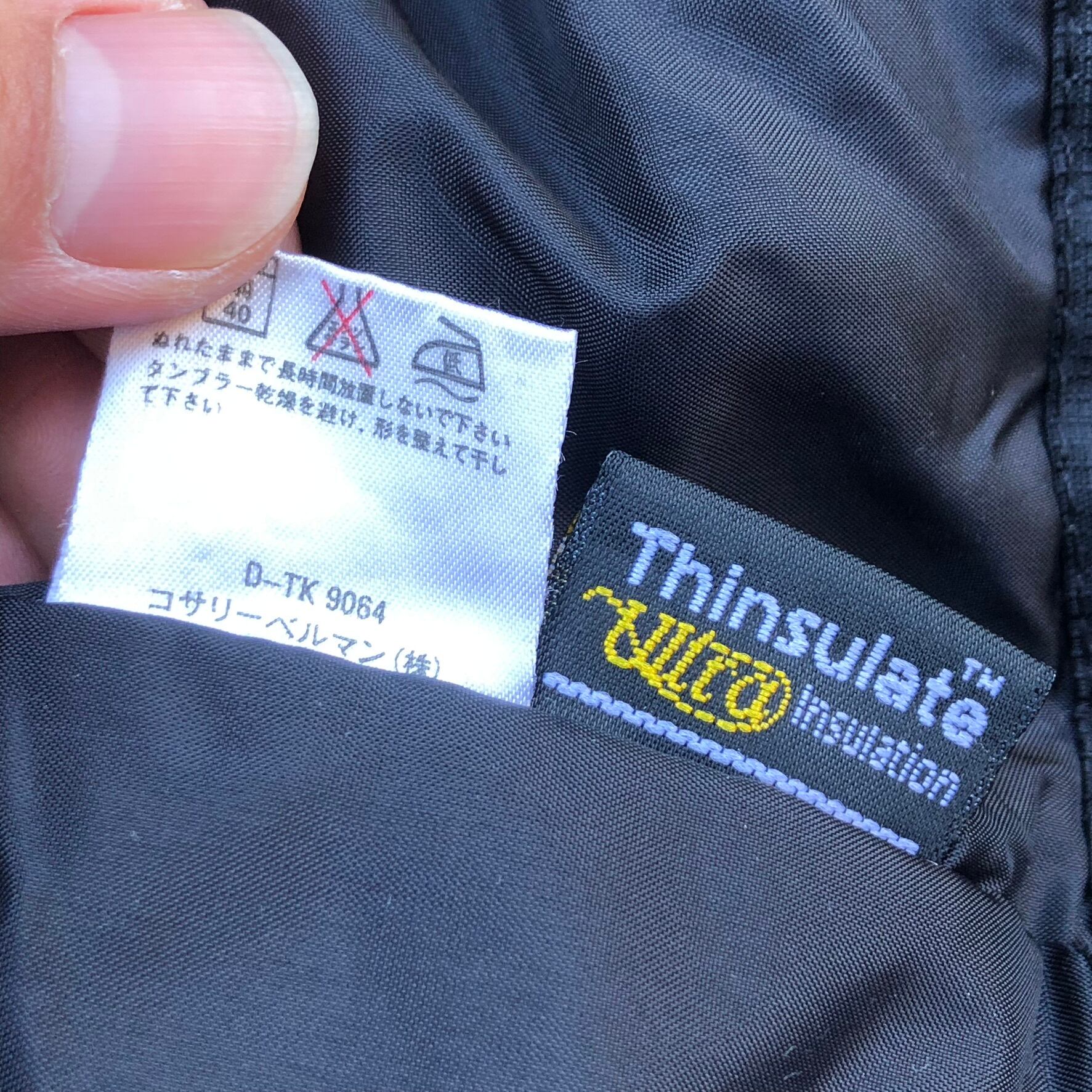 ゆったりとしたサイズ感、黄みのベージュとブラックの切り替え、境界線のブルーのライン。Thinsulateの撥水加工ナイロン、防寒性の高い中綿。