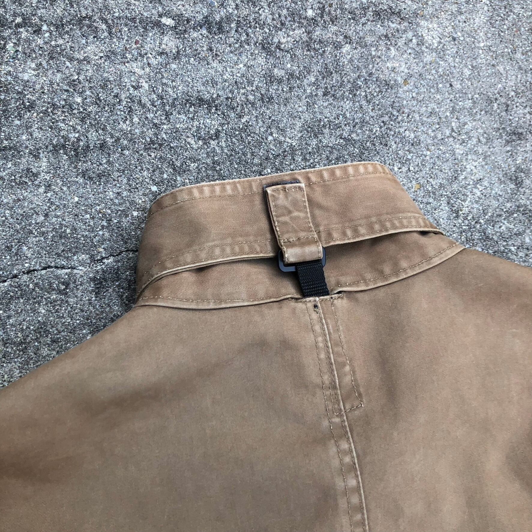やや光沢感のある圧縮コットンや、ハンティングジャケットのようなシンプルなディティールが魅力的な一着です。