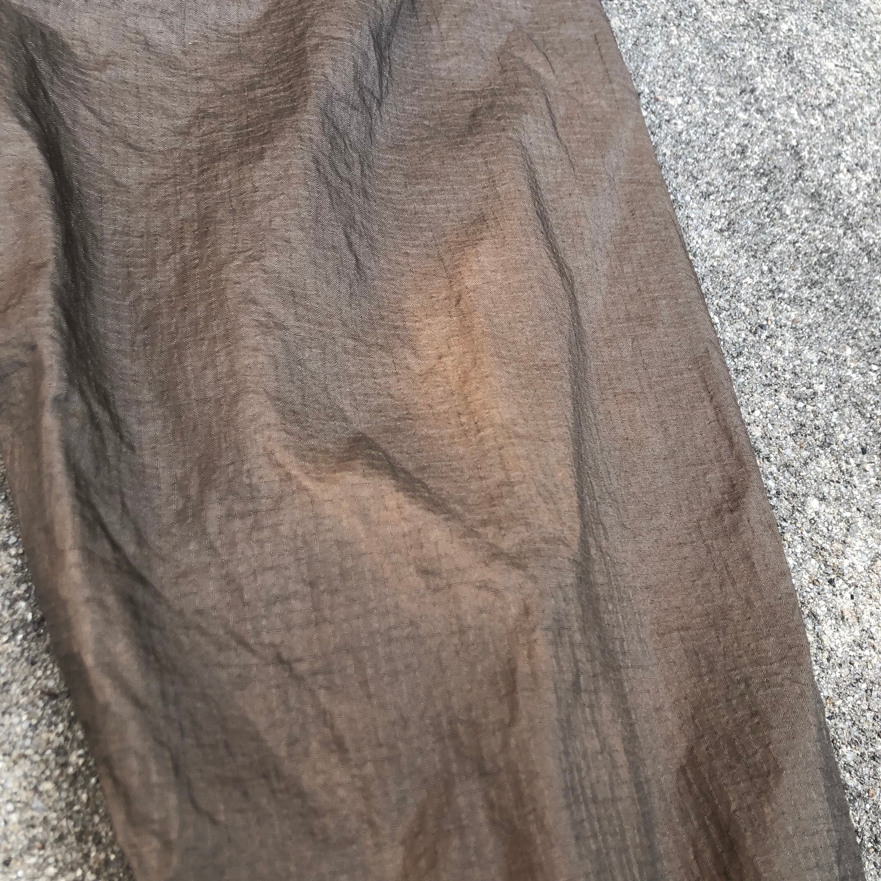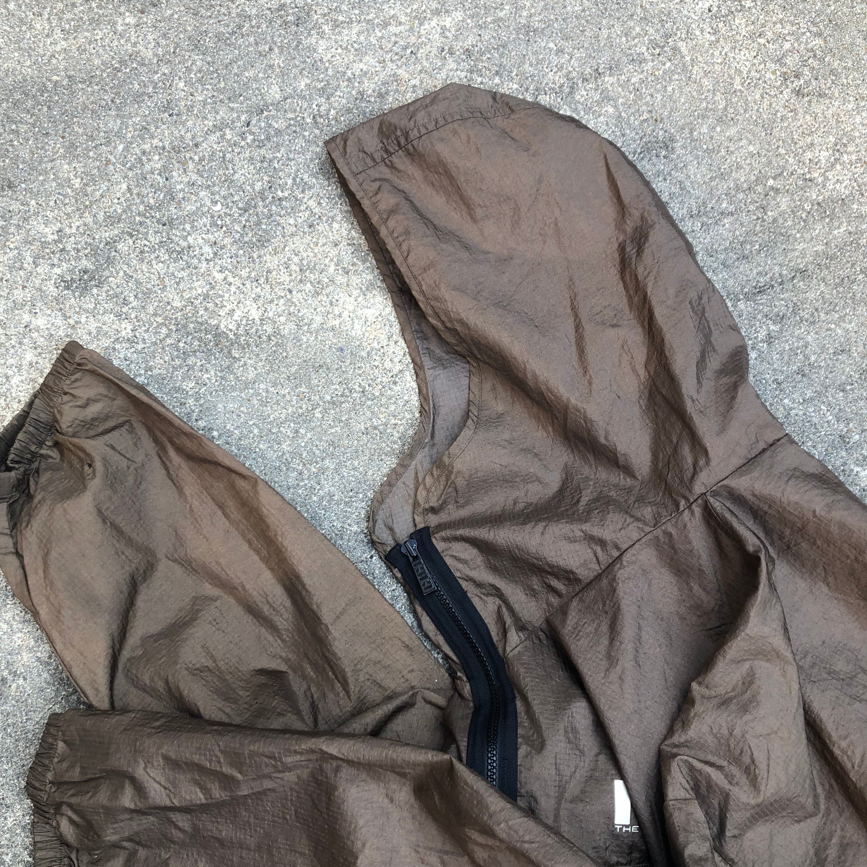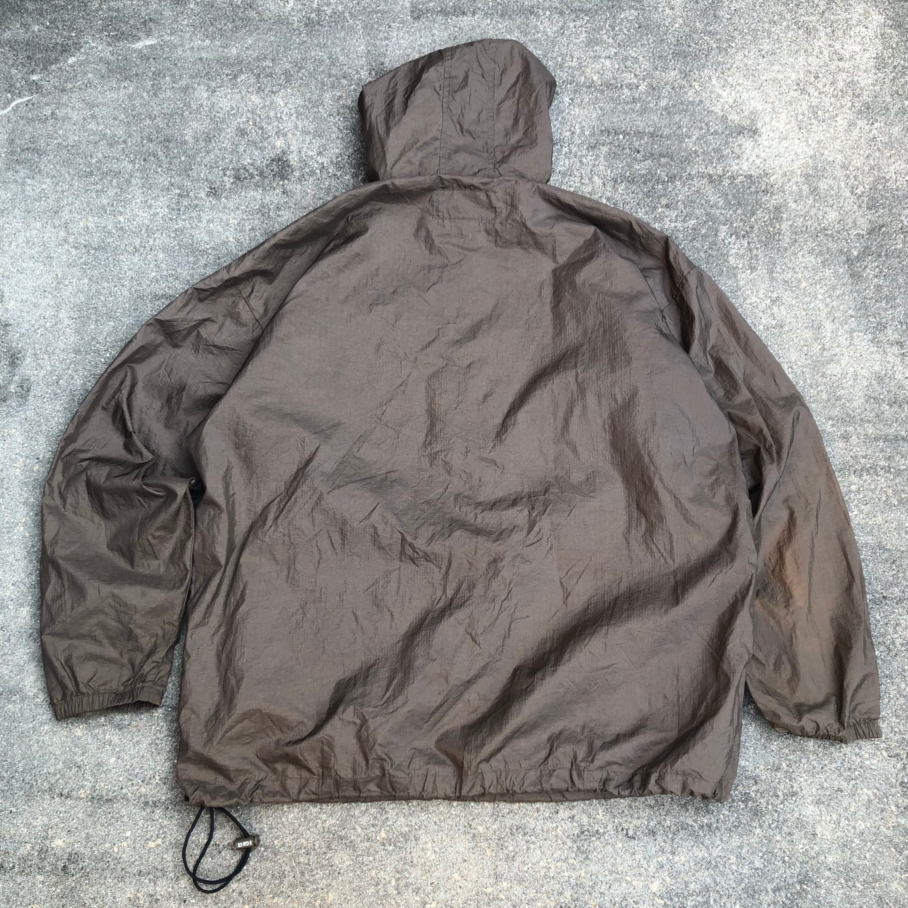 ブラウンのリップストップナイロンのシャカシャカとした生地感、切り替えにブラックのハーフジップやポケットのジッパー。