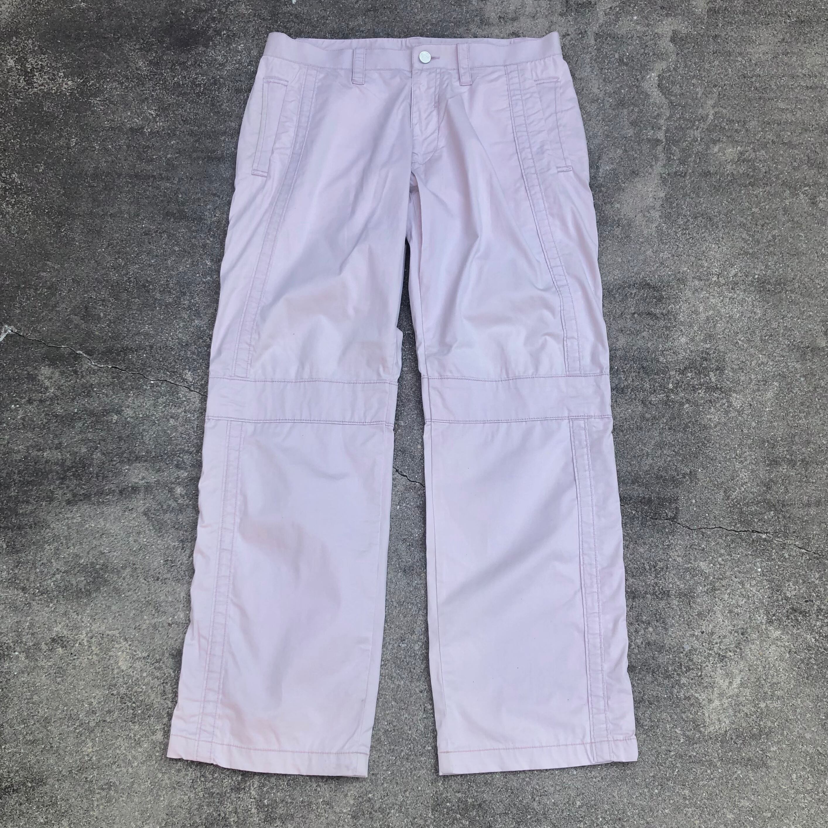サイドや膝周りのデザインシームテープ、ストレートなシルエット、薄いピンクとアイボリーの中間ぐらいの柔らかい印象のカラー。