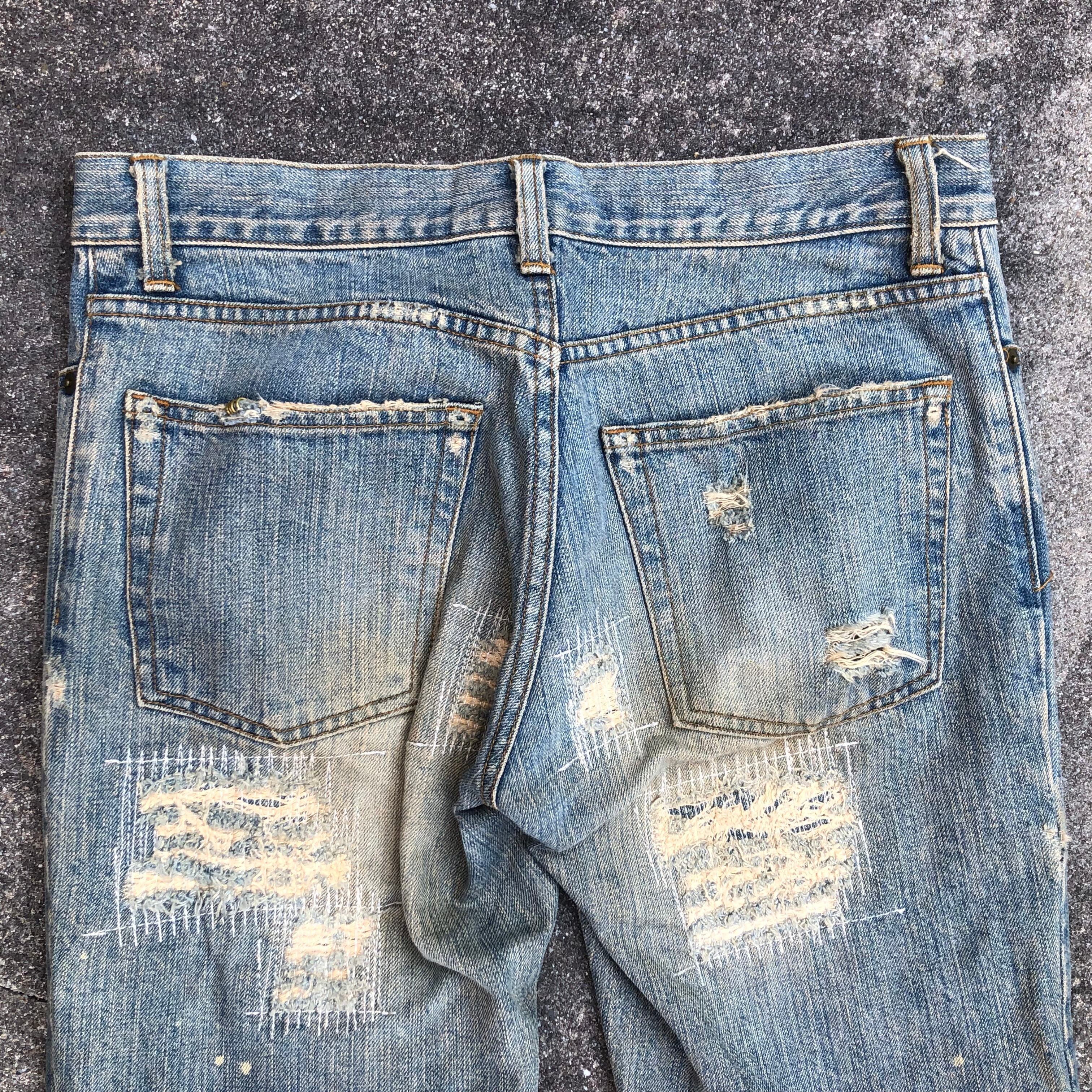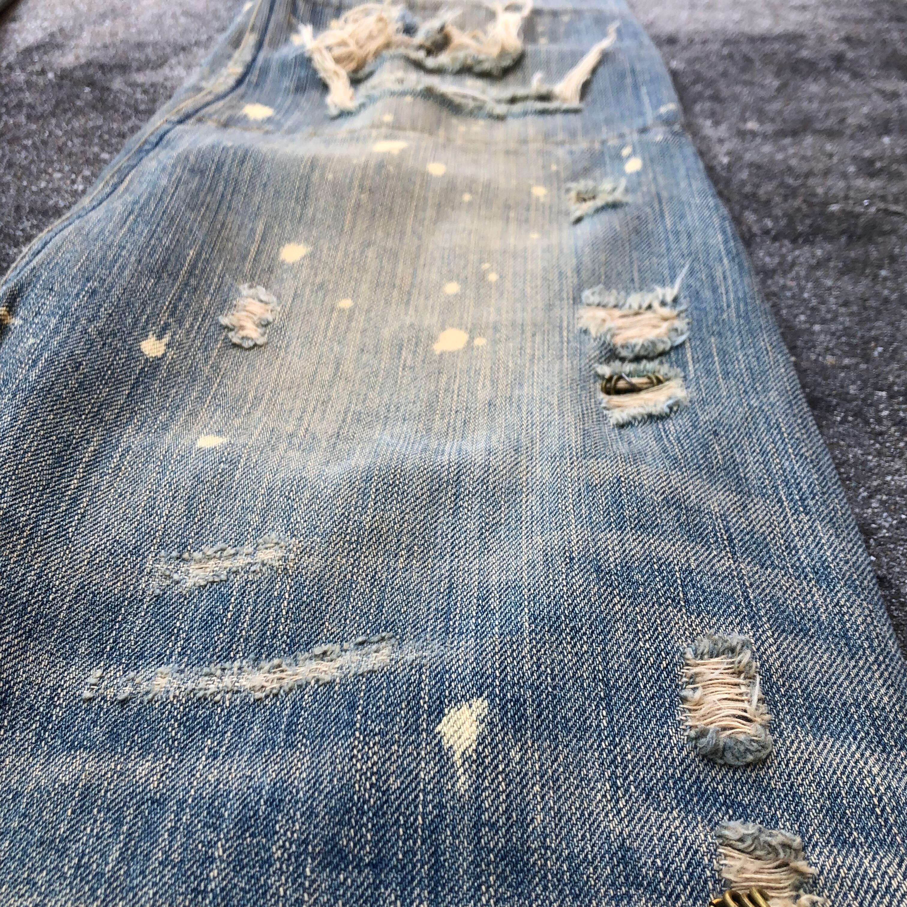 見事なダメージ、リペア、ブリーチのデザイン、浅めの股上、細身のフレアシルエット。