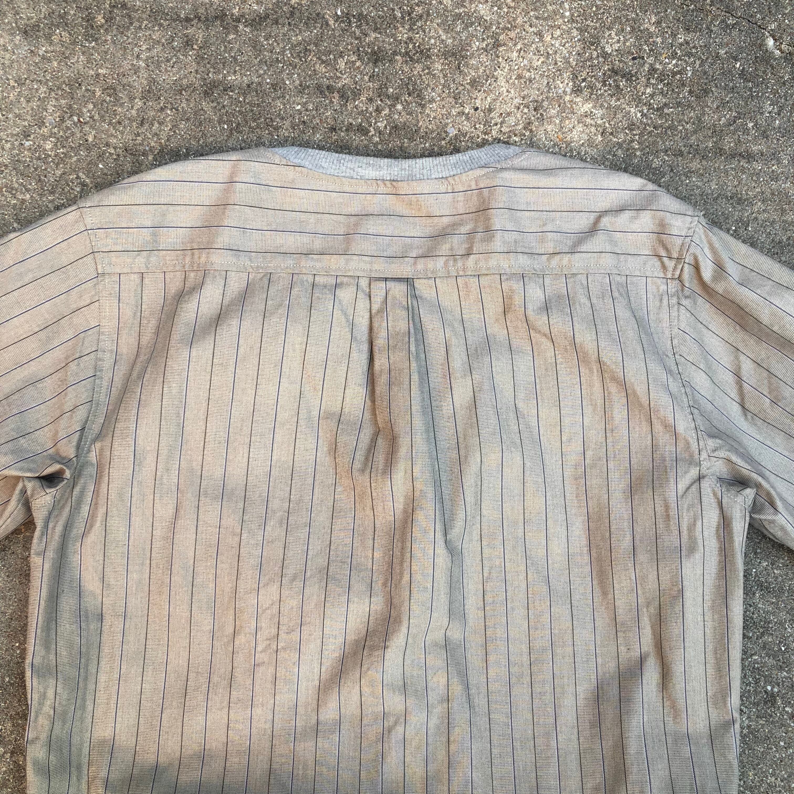 細いボーダーの柄、ウッドボタン、ベージュ系のカラー、ガサガサとしたやや密度の高いコットン生地が魅力的。