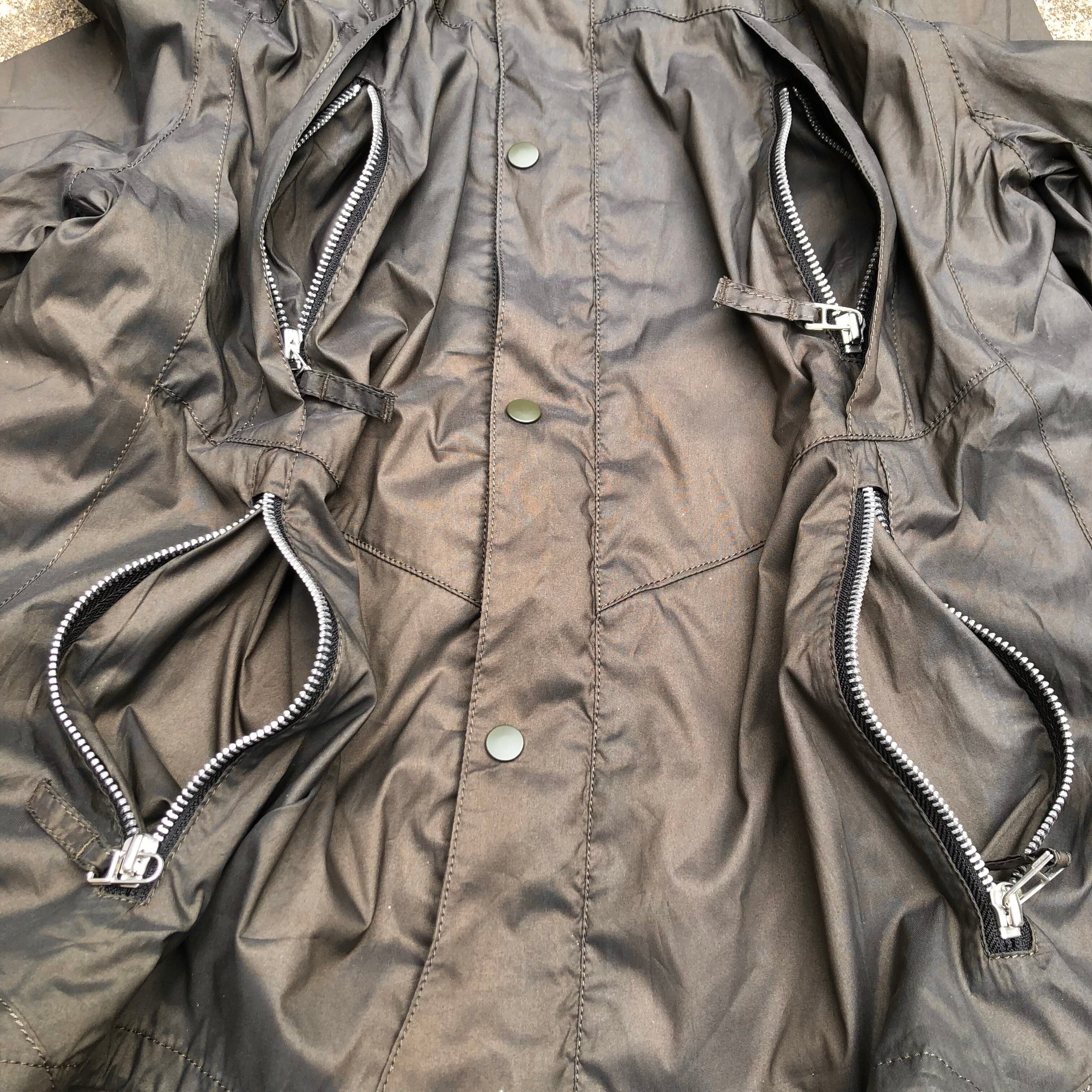 細身のシルエット、大きく八の字に連なるジップポケット、ジッパーとスナップボタンの比翼のフロント。