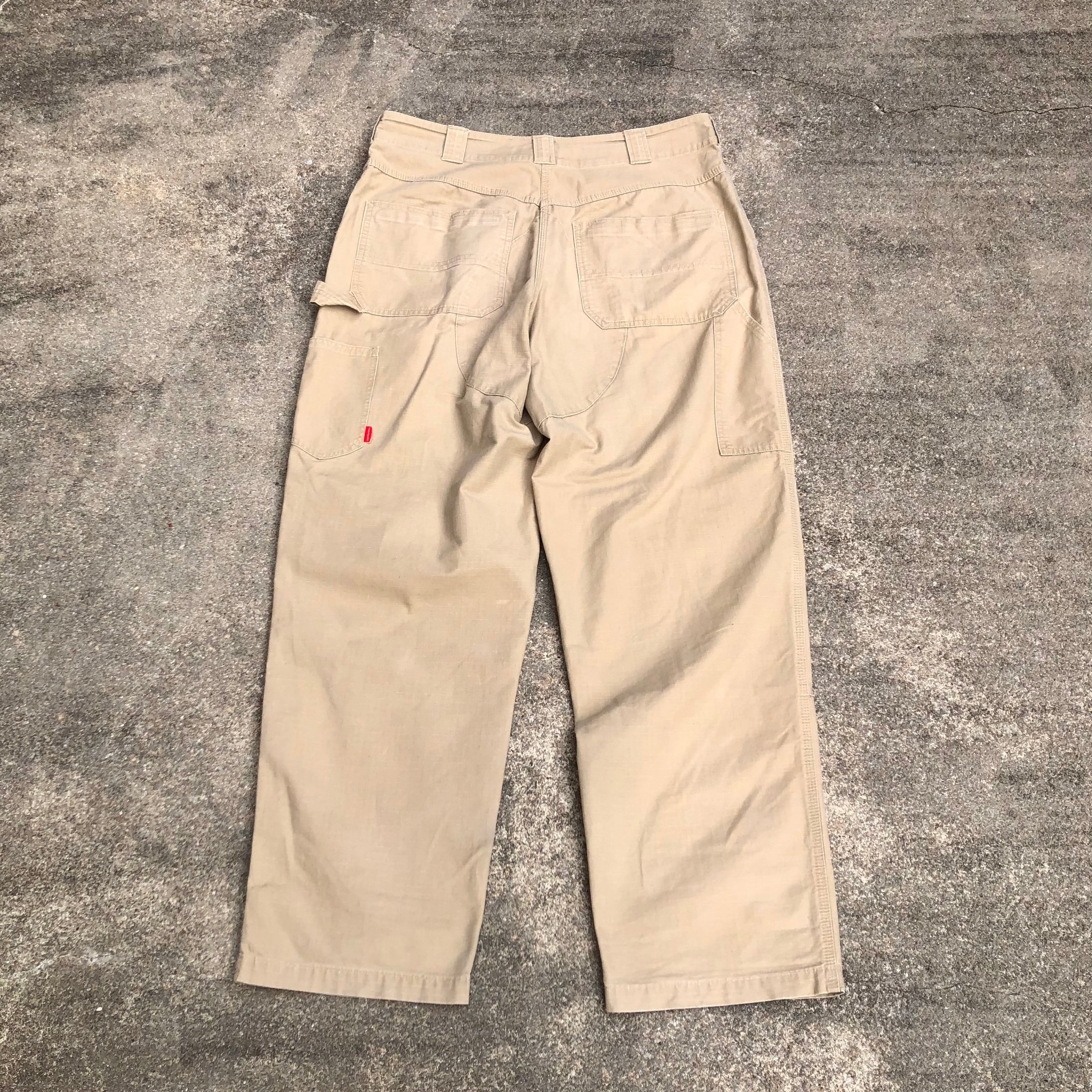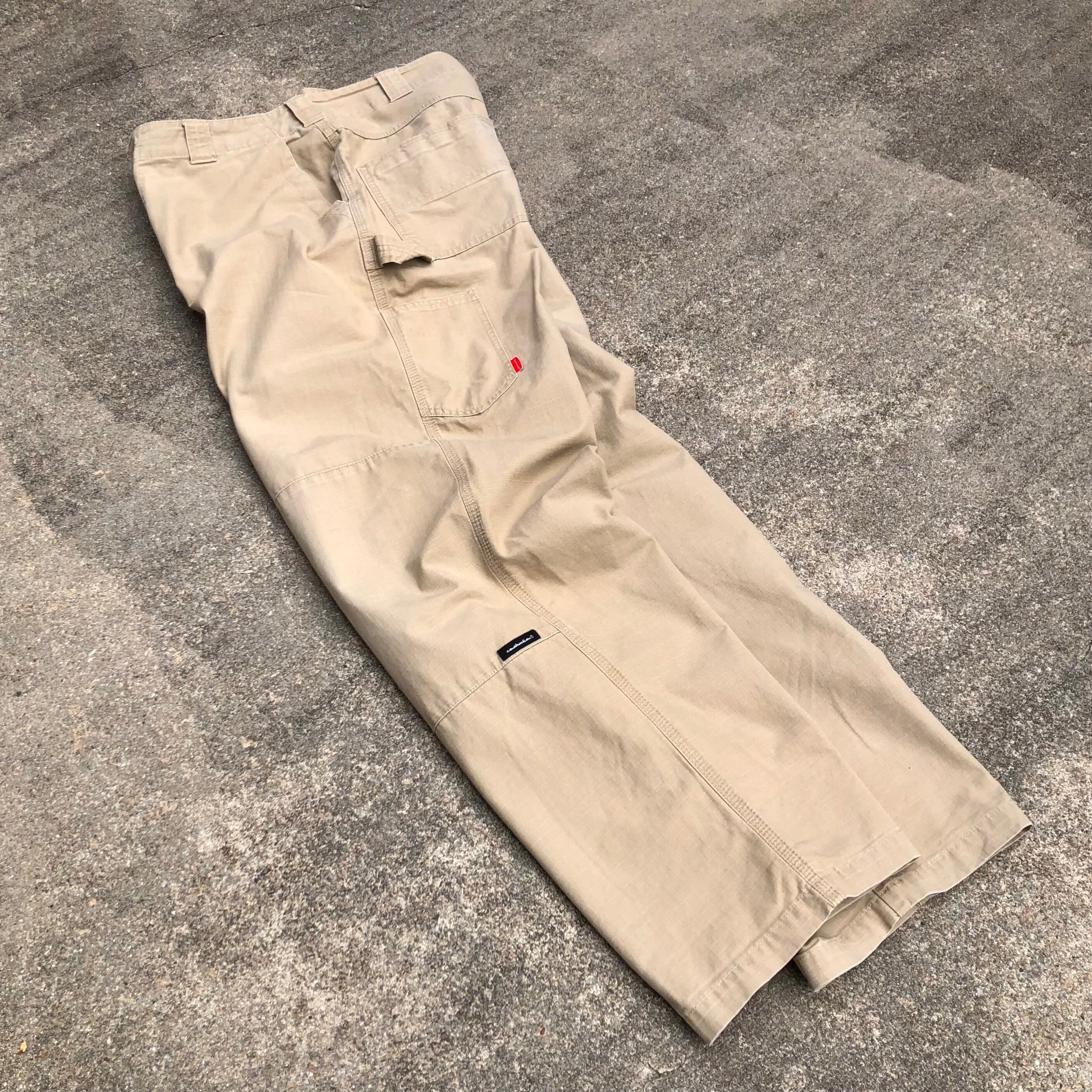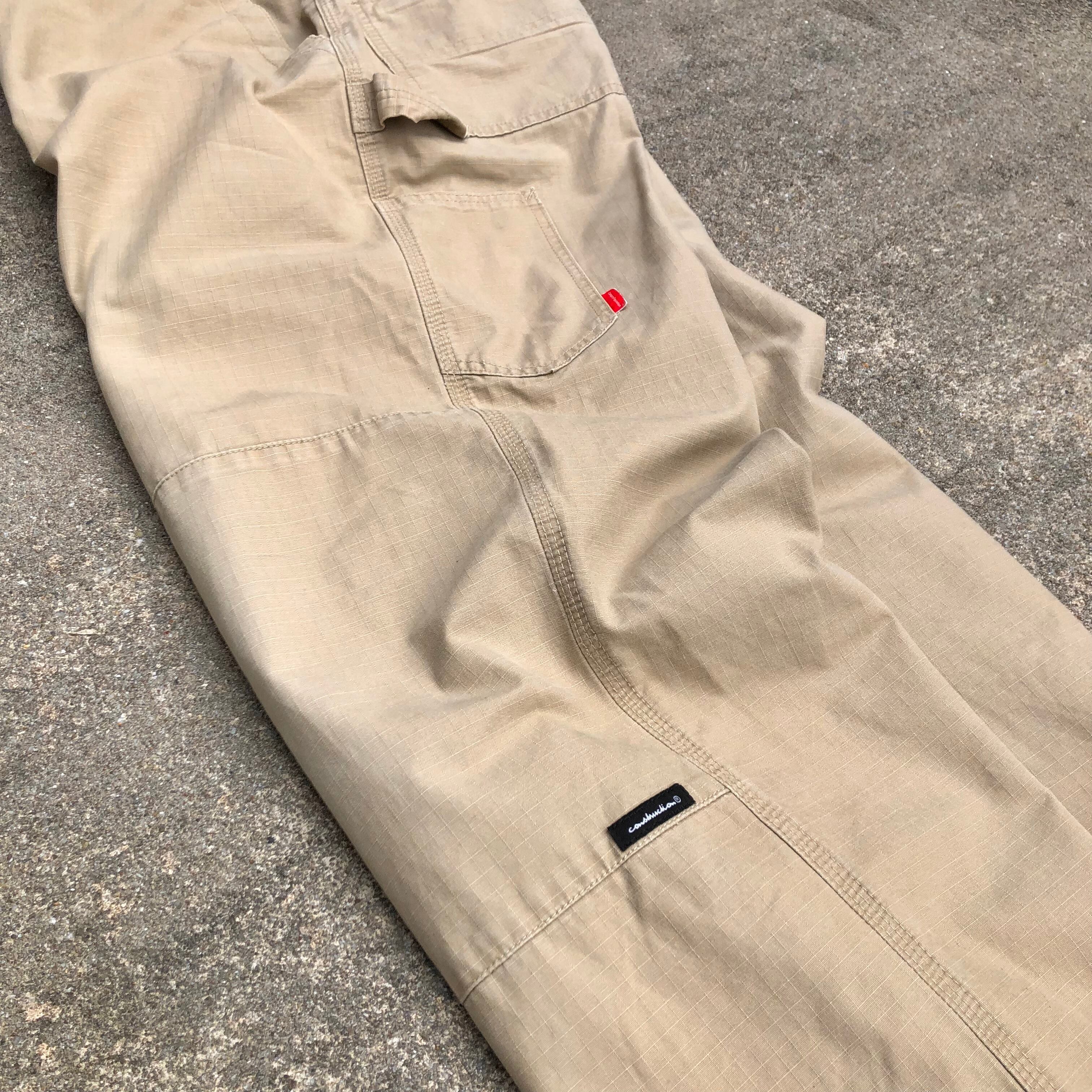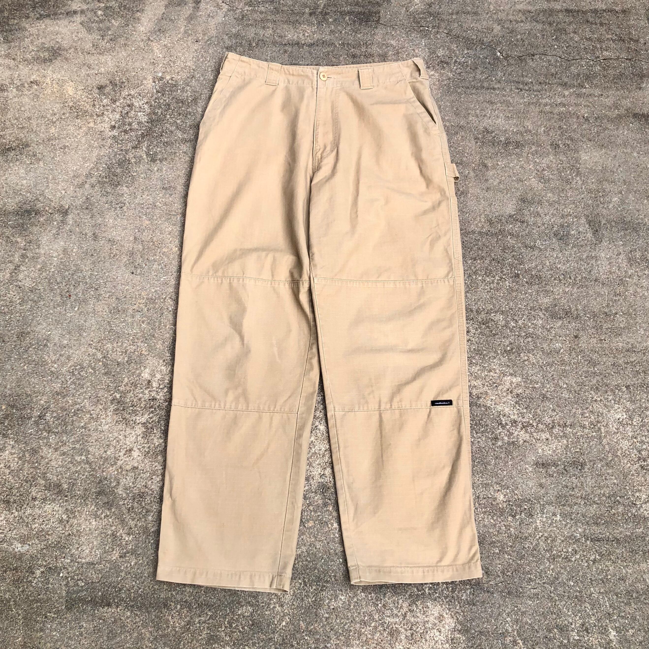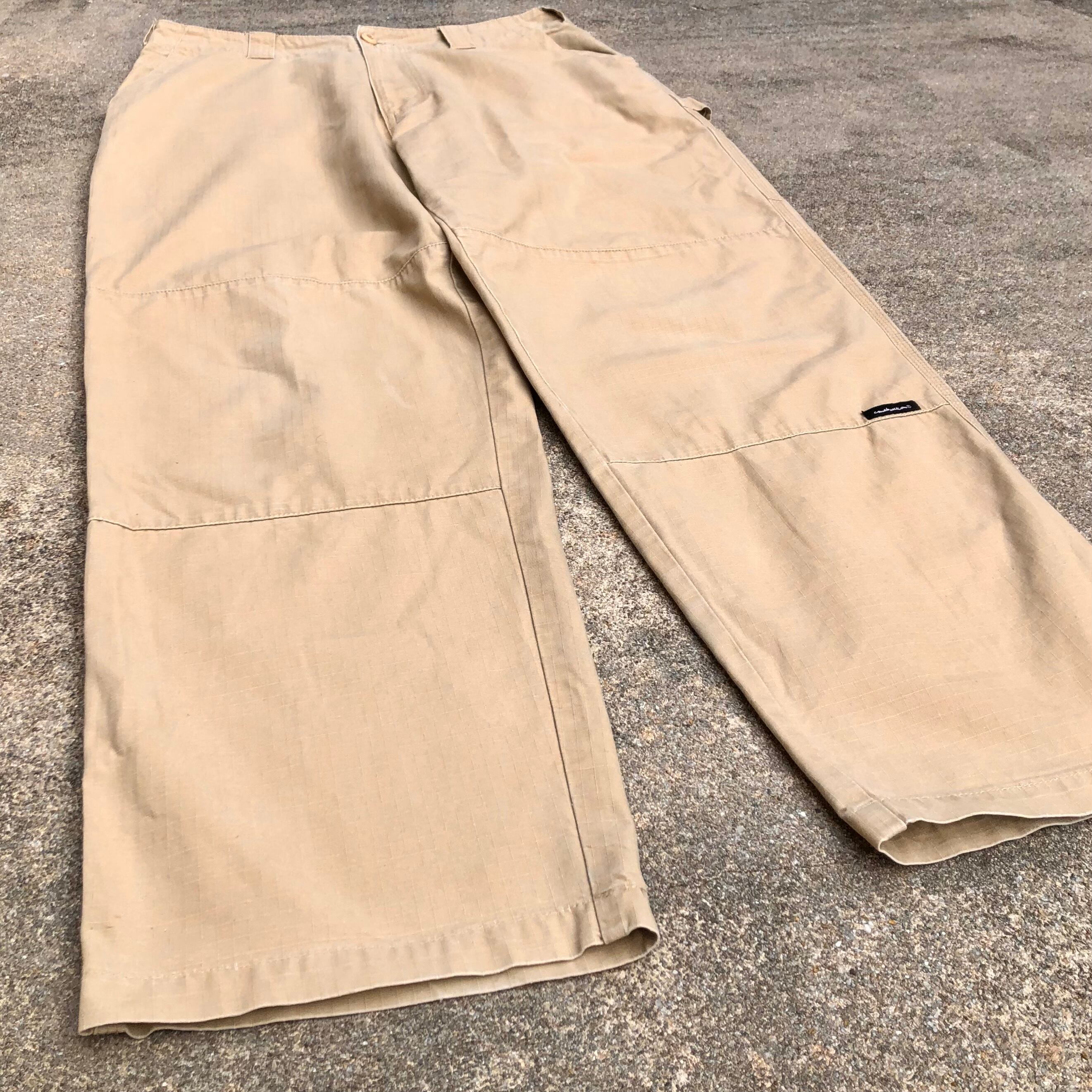 リップストップのコットン生地、ペインターらしいディティール、ダブルニー、太テーパードのバギーシルエット。