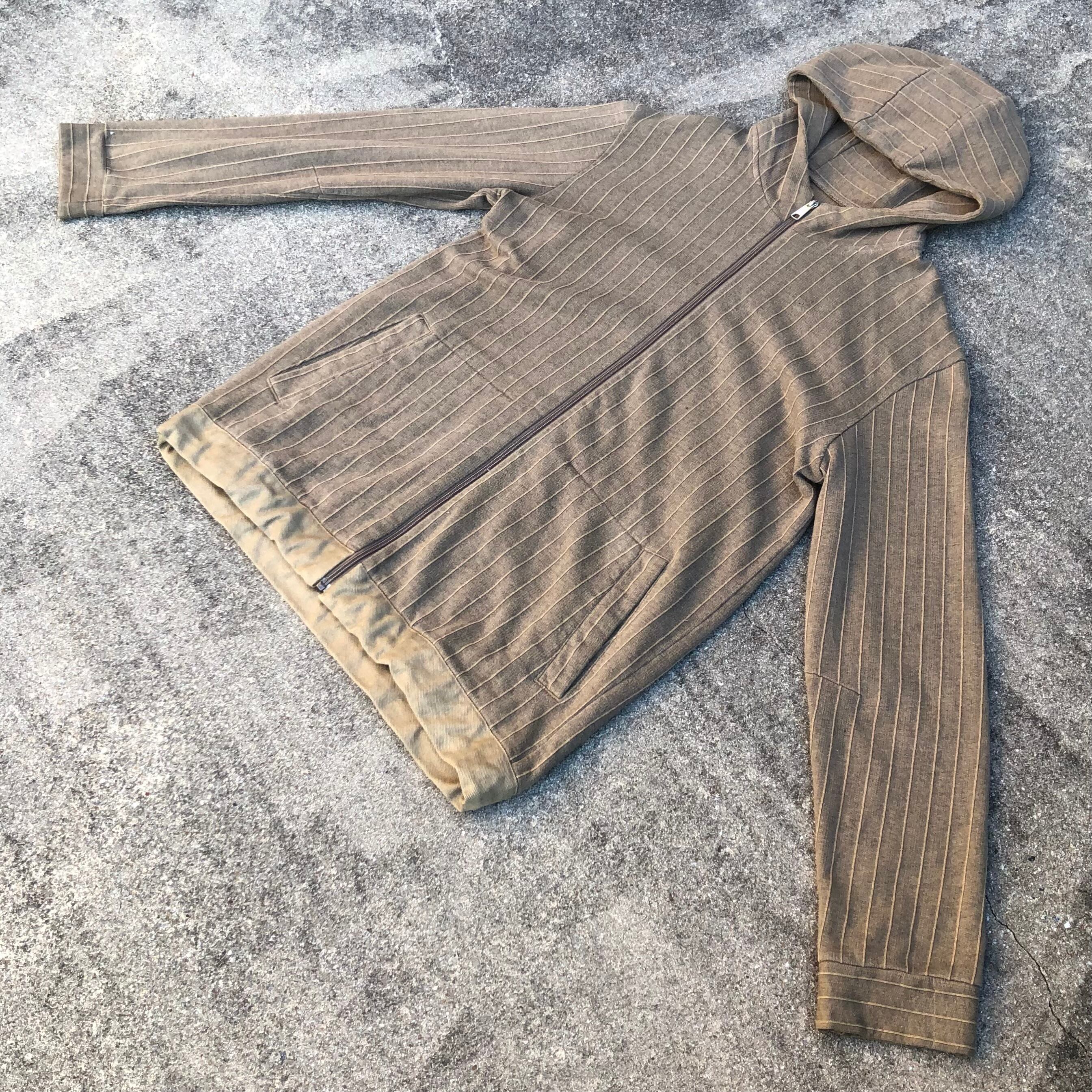 立体的な細ラインのボーダー柄、ブラウンベースのカラーリングや体の形に合わせたやや細身なY2Kらしいシルエットが魅力的な一着。