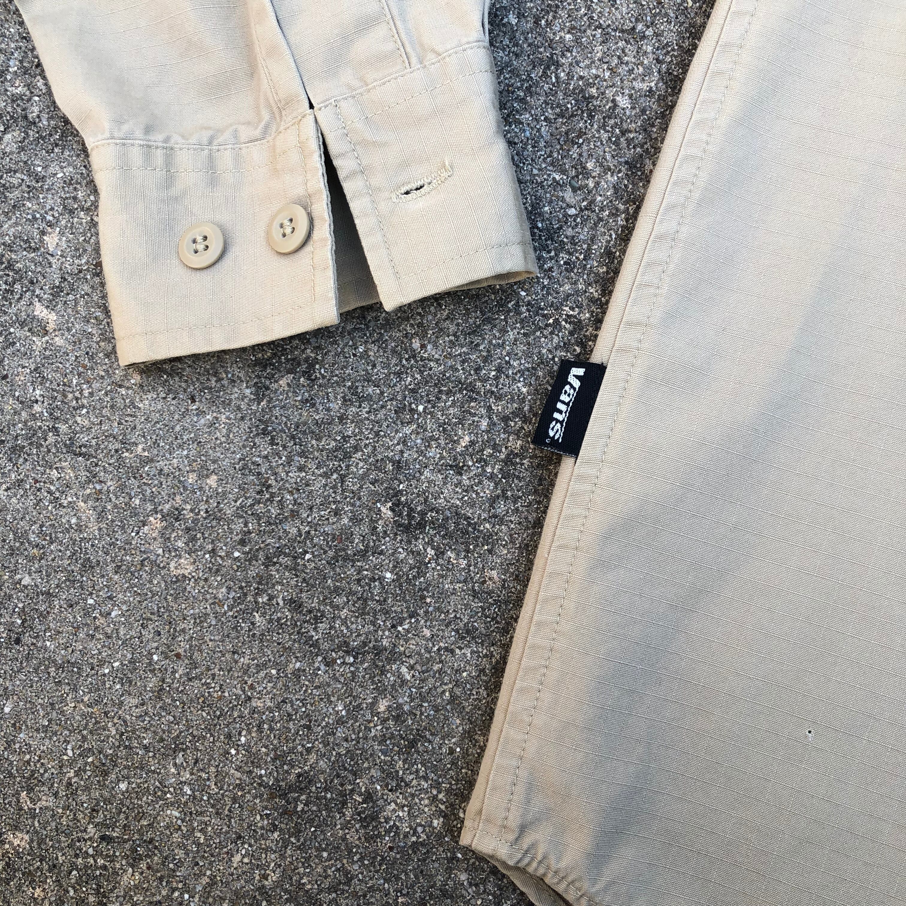 マチのある2つの立体ポケット、左胸ポケの上にはブランドネームが書かれた細いベルクロテープ、リップストップの生地感など、ミリタリー要素を優しく取り入れたシンプルな一着。