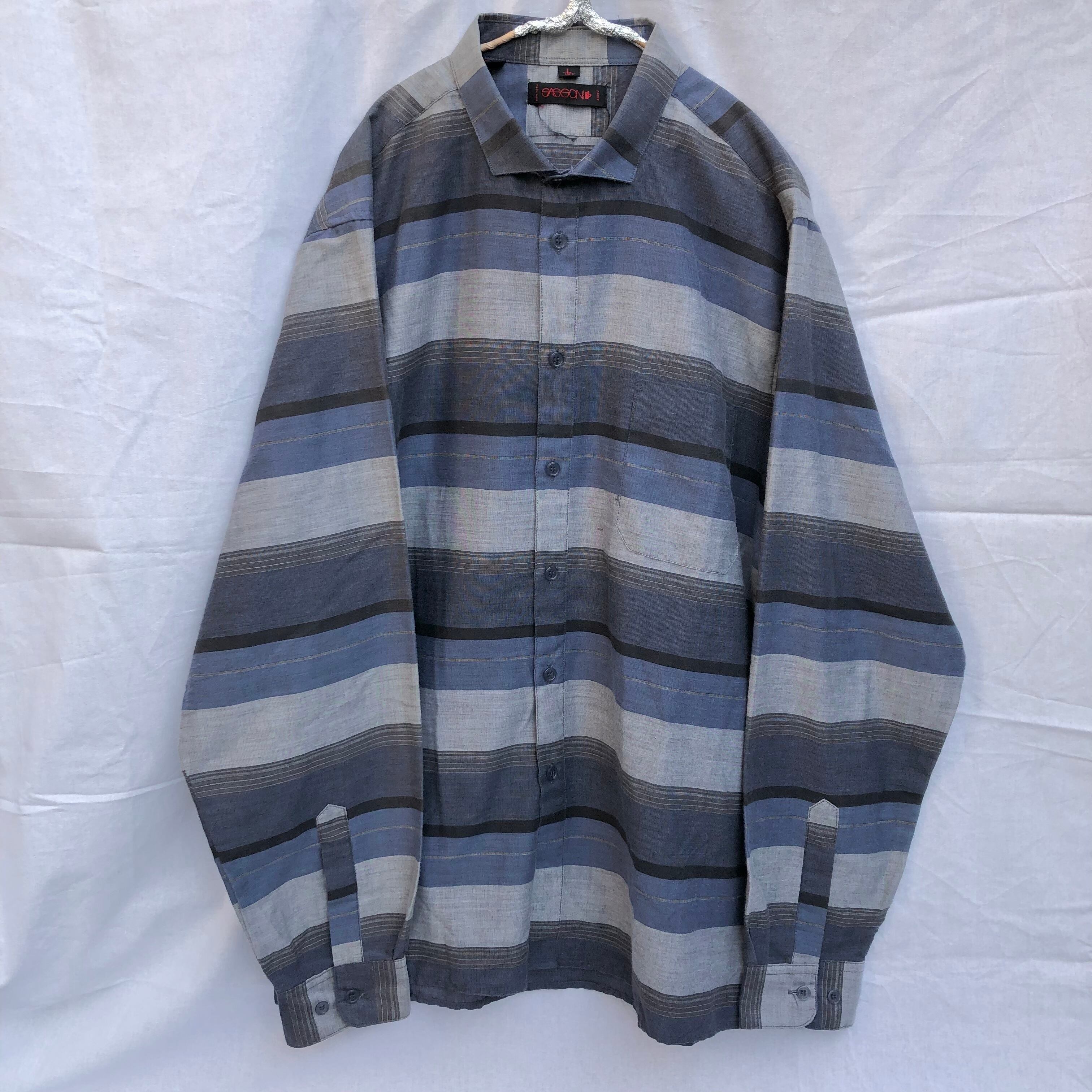 青系のボーダーパターンが特徴的な長袖シャツ。