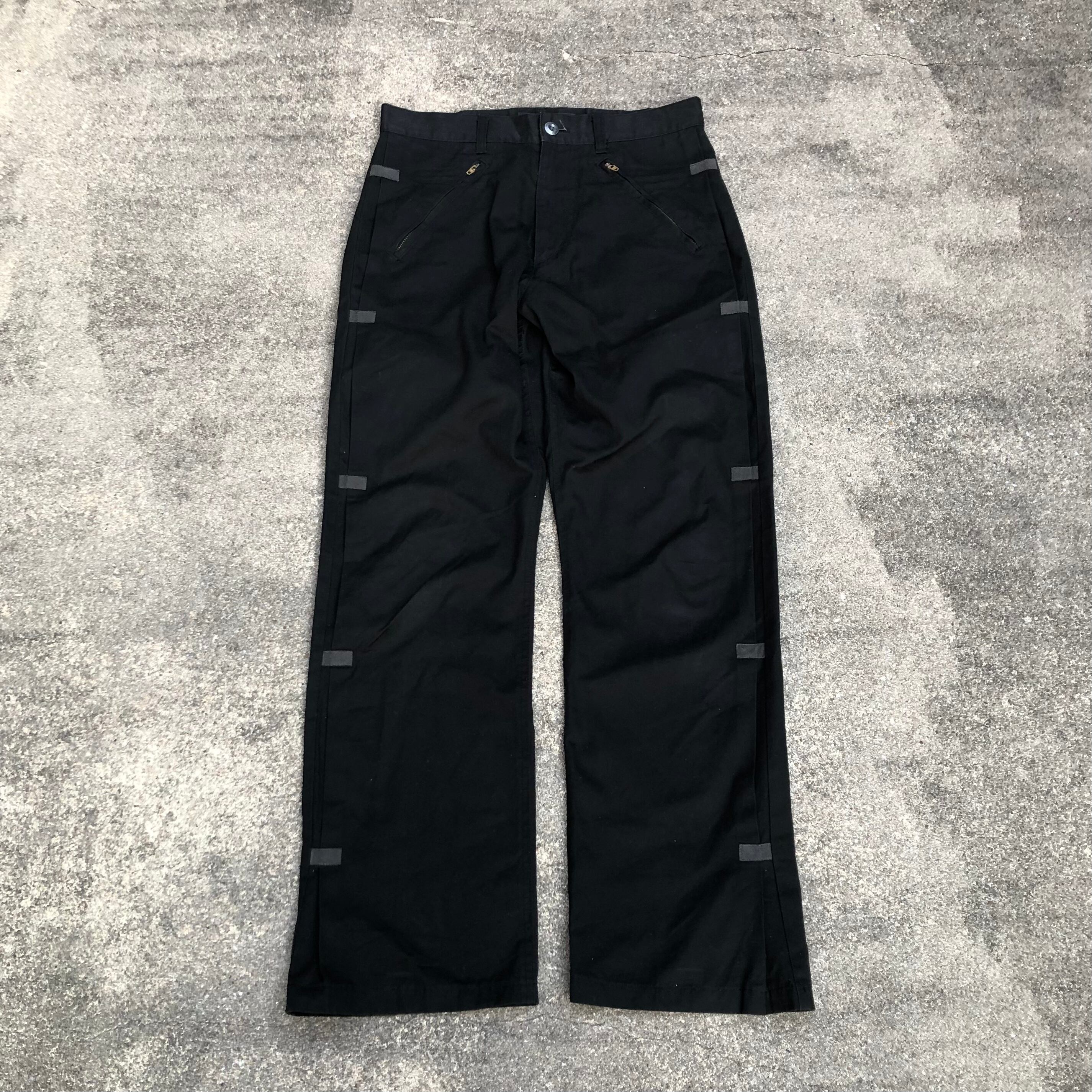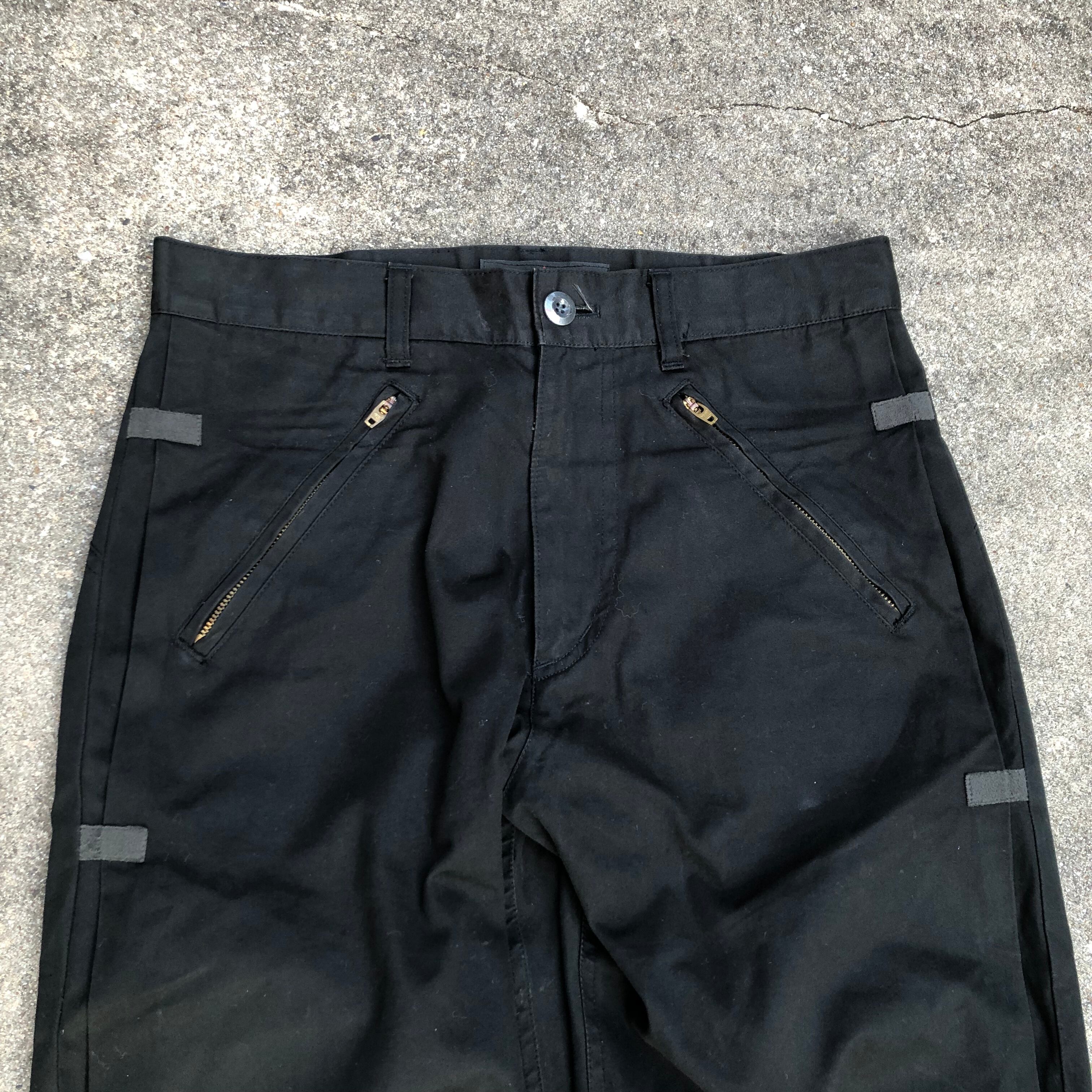 サイドをライン状に折り込み数箇所をグレーのベロア生地で留めた、個性的なボンテージパンツ。