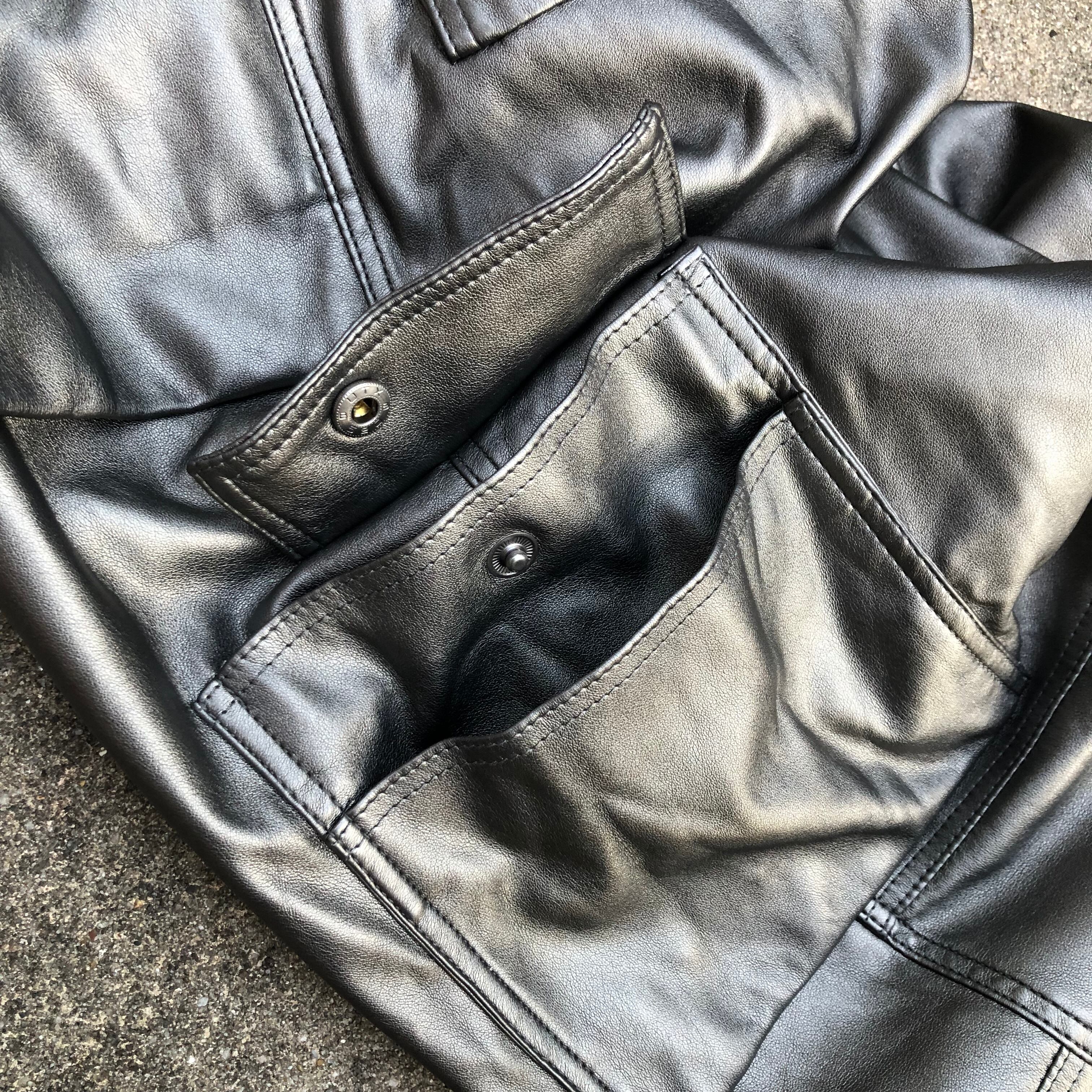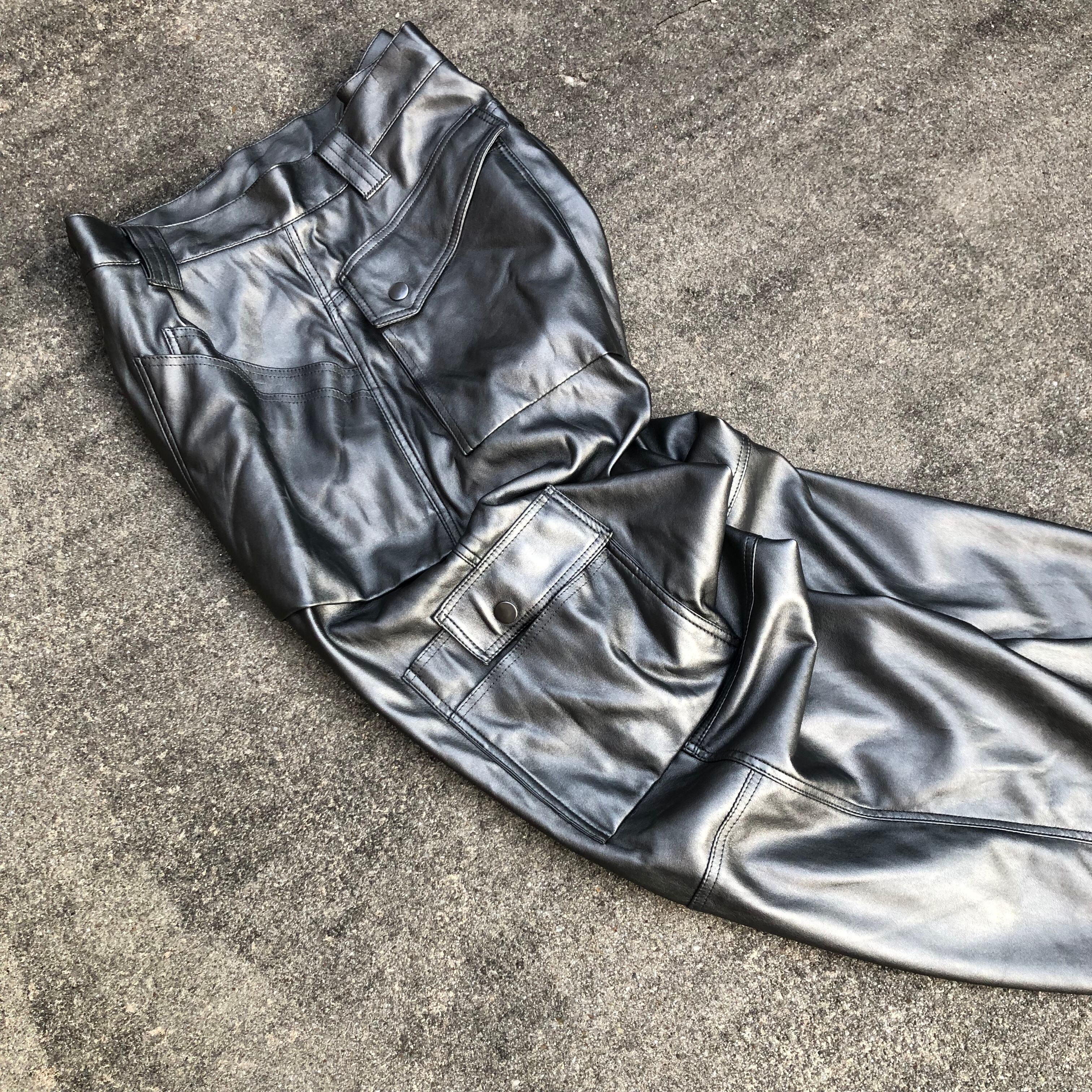 ポリウレタンのヴィーガンレザー特有のツヤのある質感、ダブル二ー、カーゴポケット。