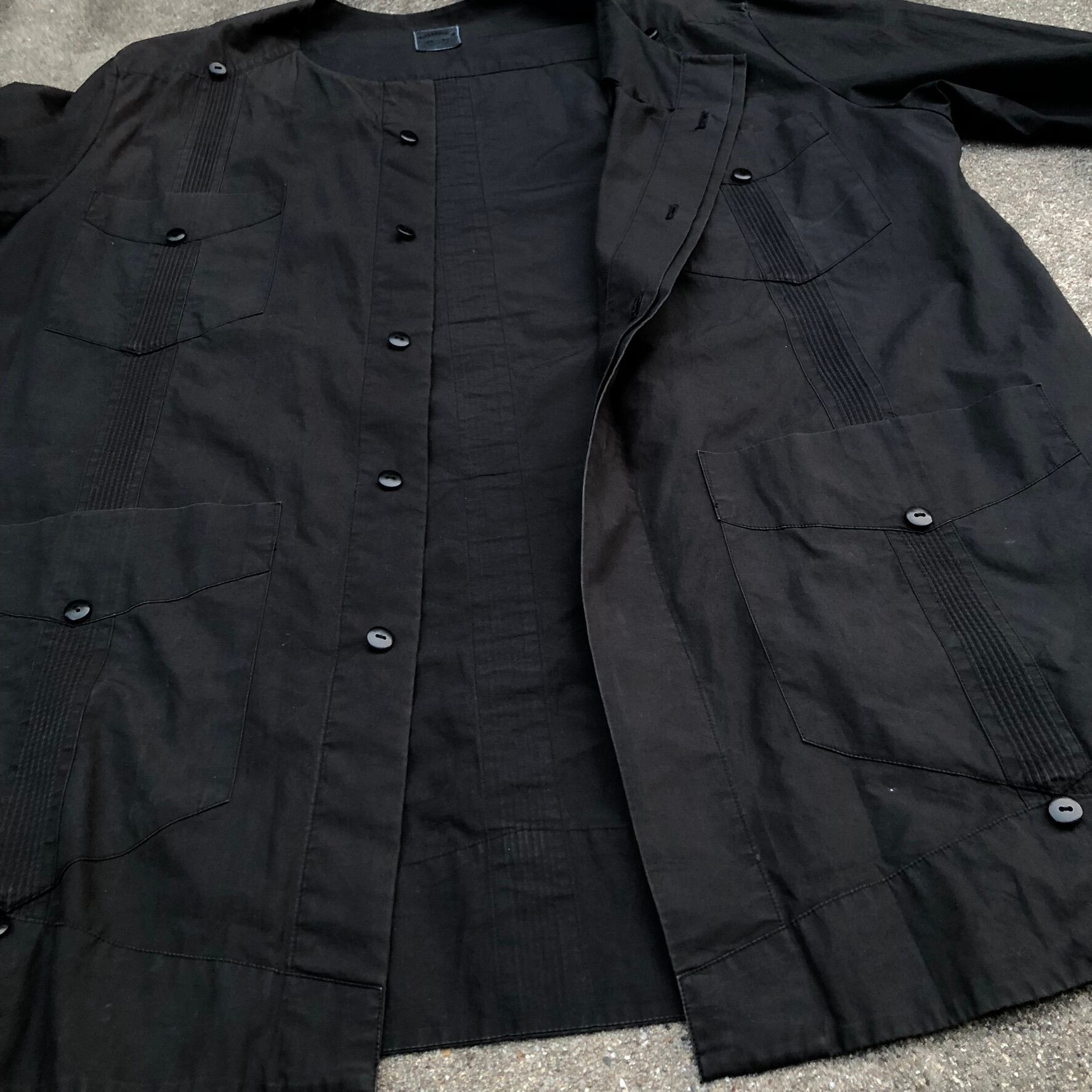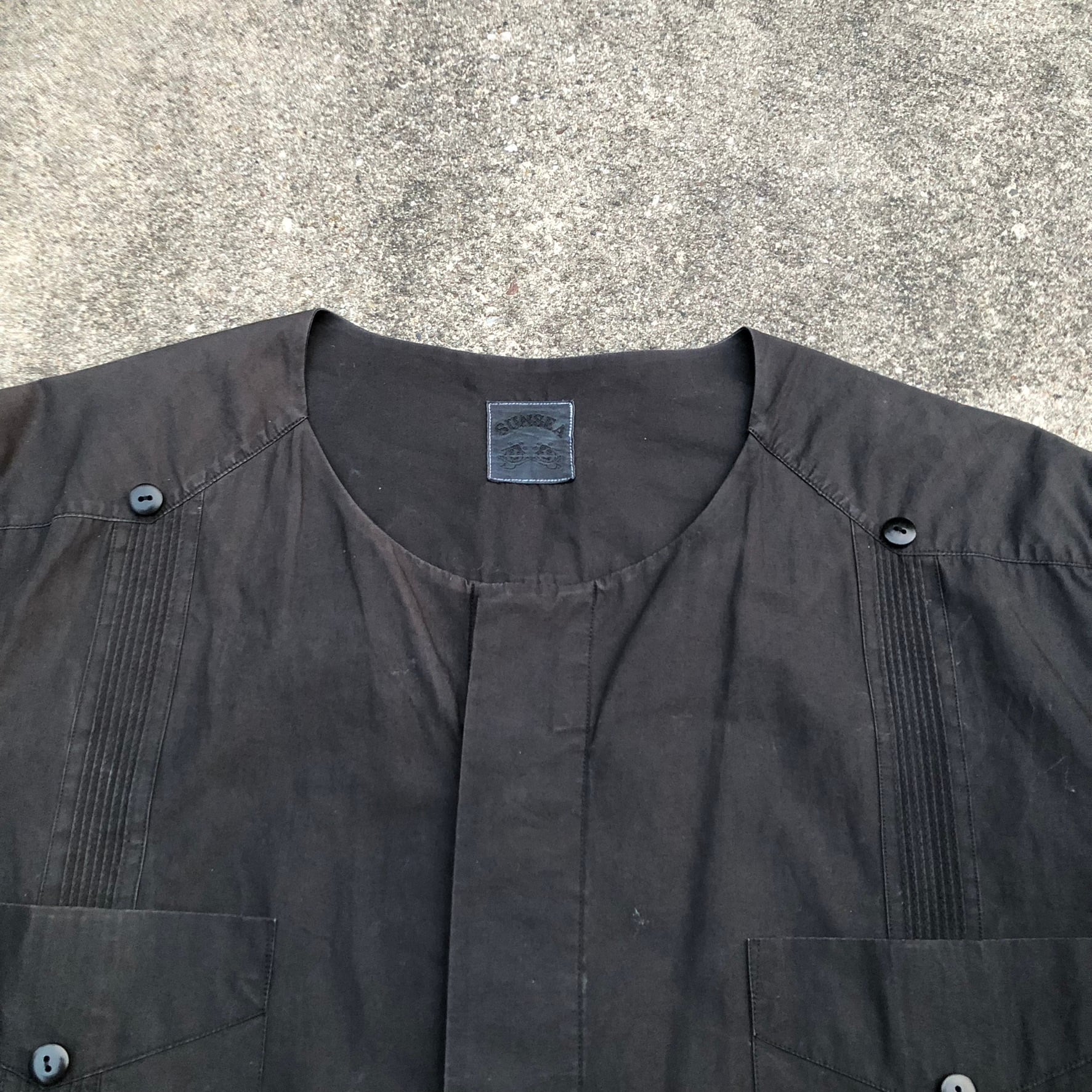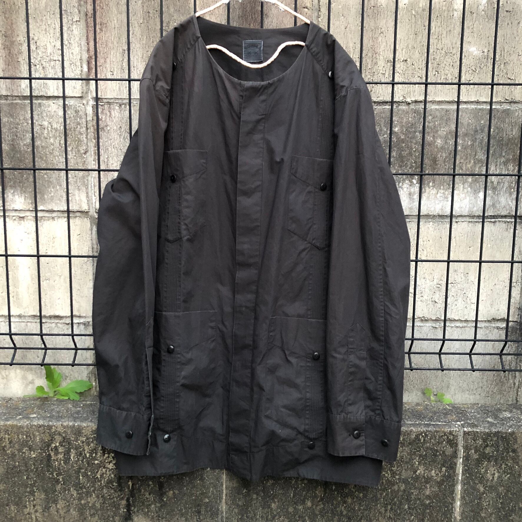 首元のレイヤードを楽しめる広めなノーカラー、上品な比翼のフロント、サンシーらしいガサッとした上質なコットン生地。