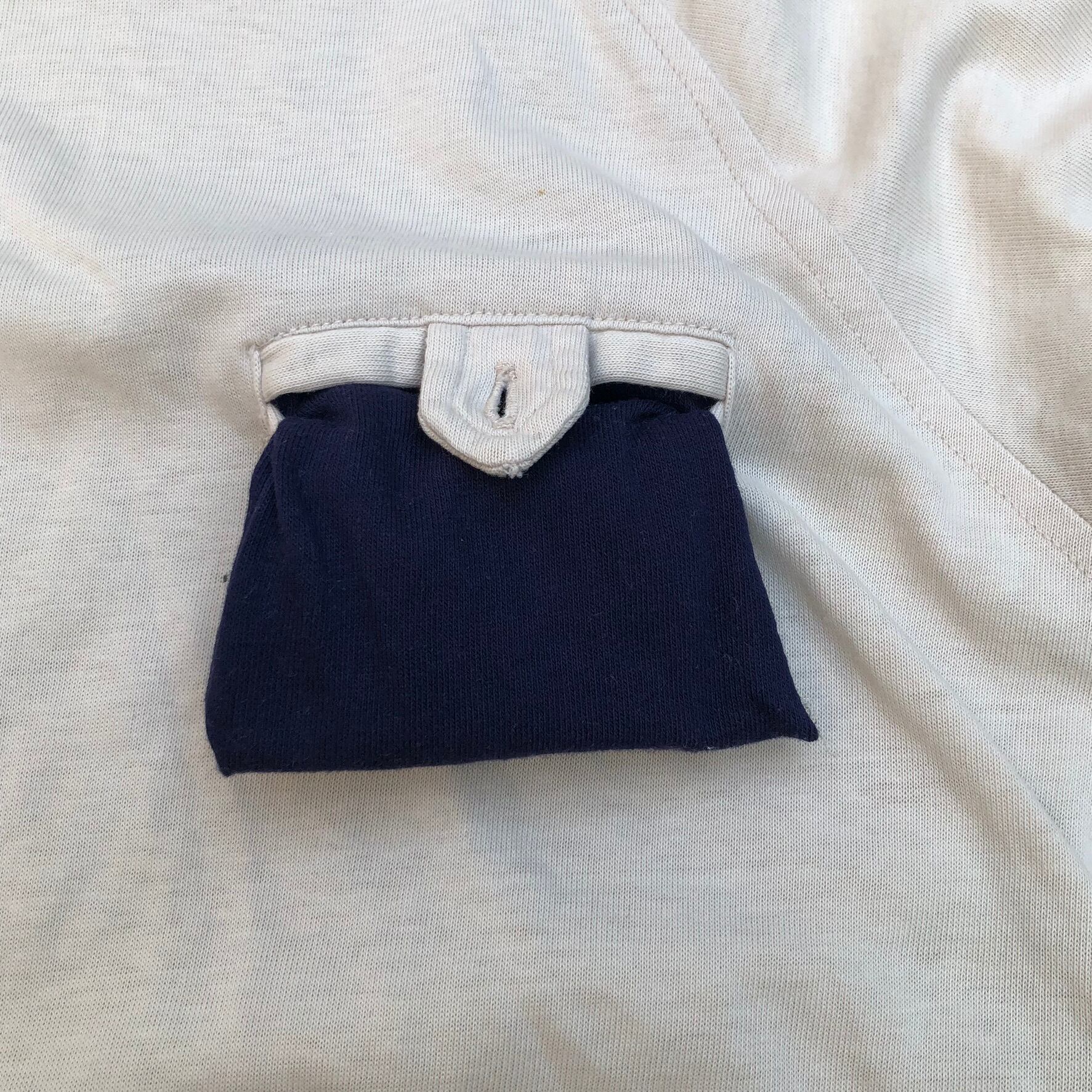 胸ポケットの裏地や左腰のタグは紺色、90年代らしいシンプルな一着。