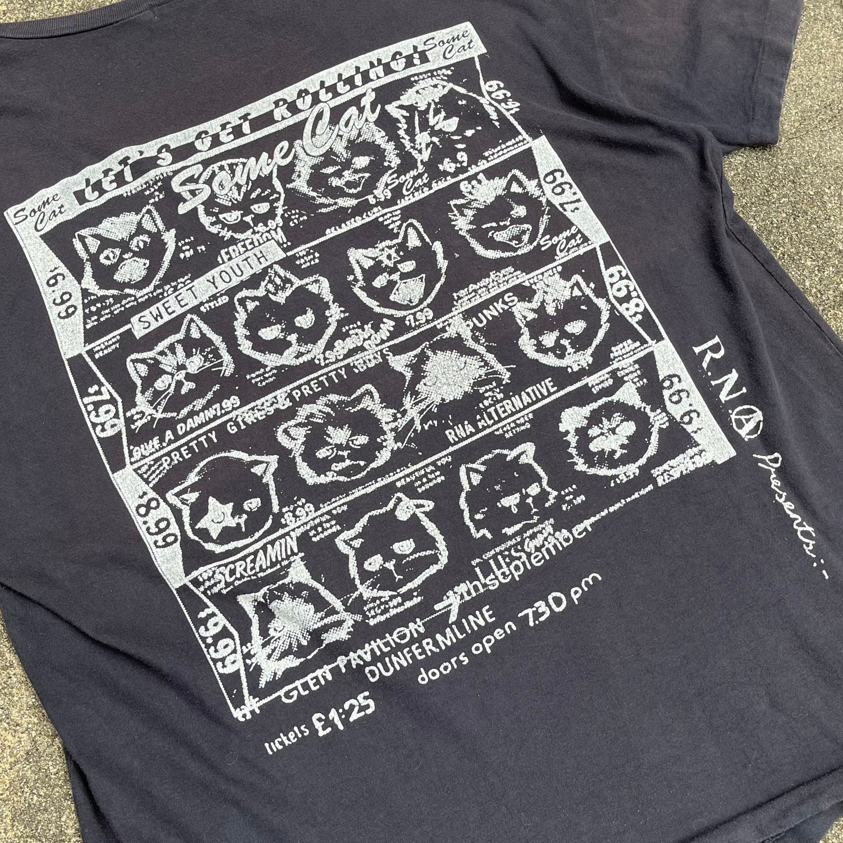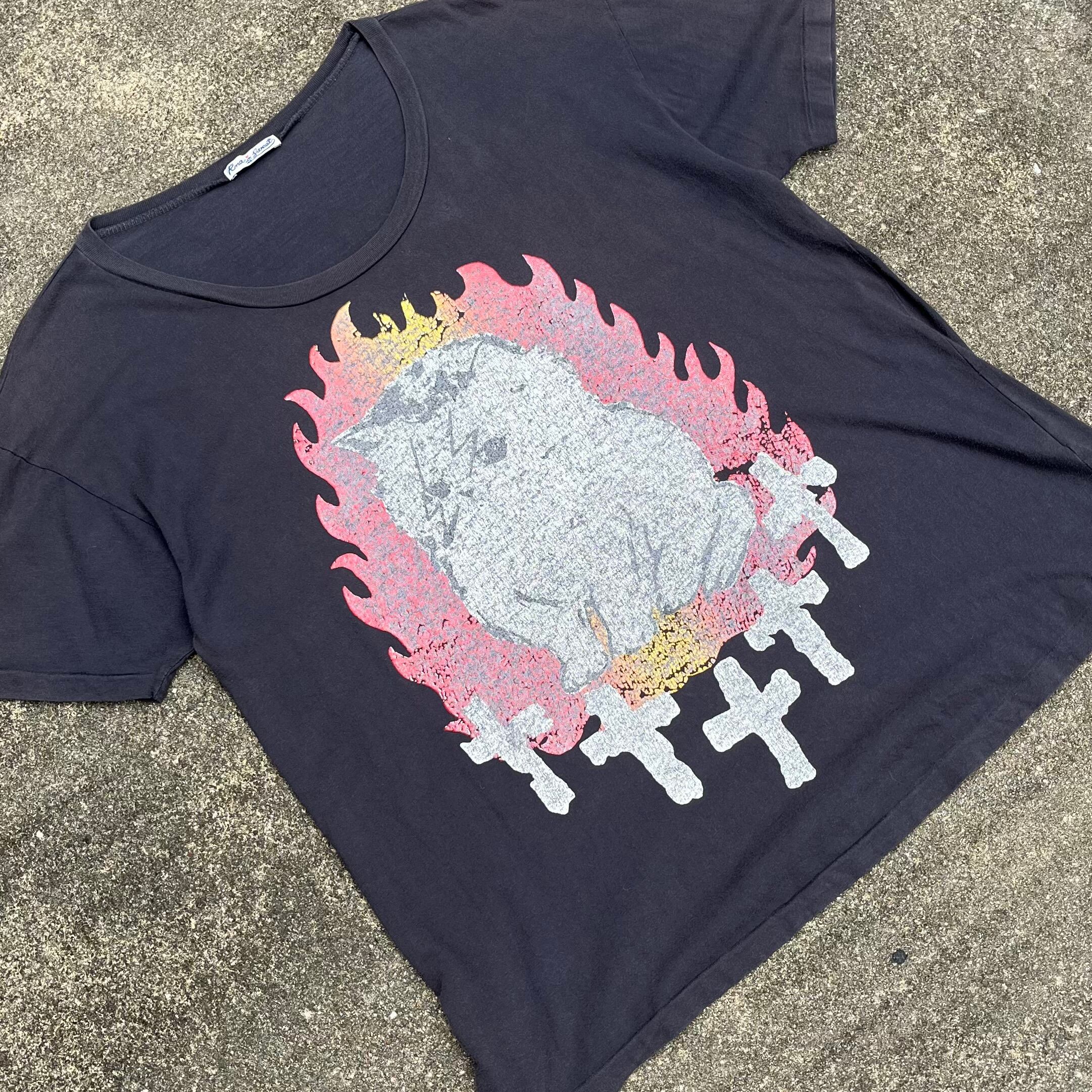 フロントには燃える猫と十字架、背面にはイベントのフライヤー的な何かがプリントされた可愛らしい一着。