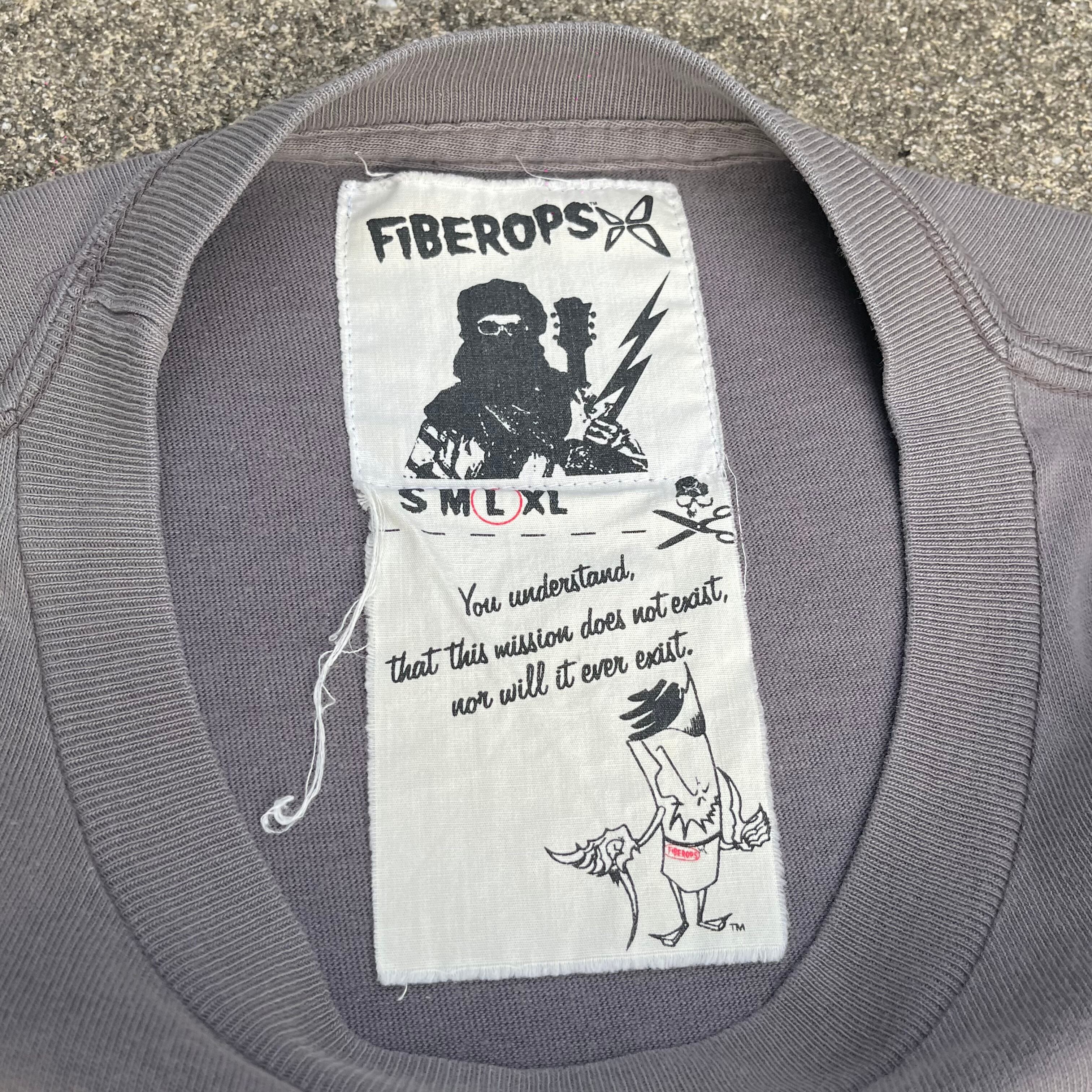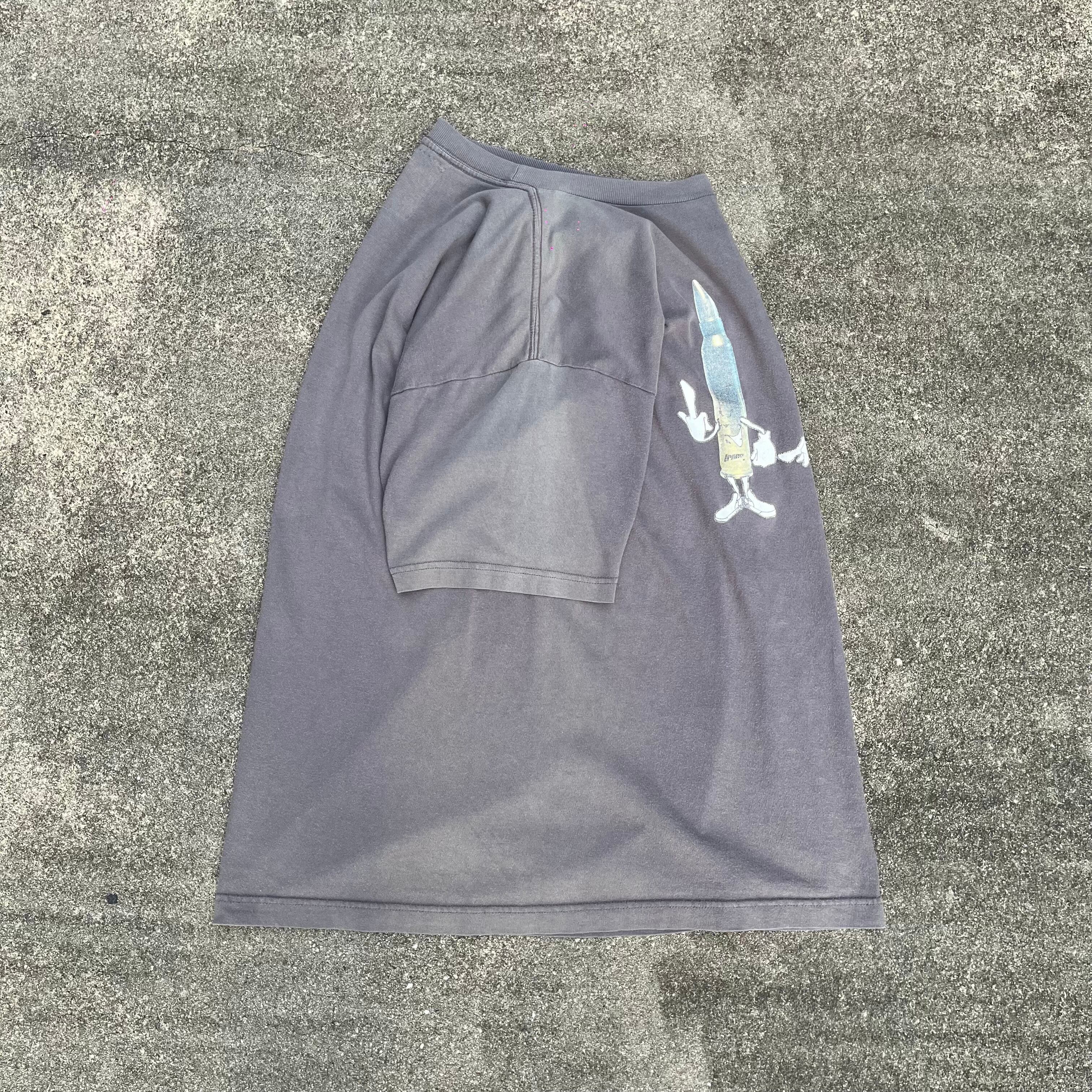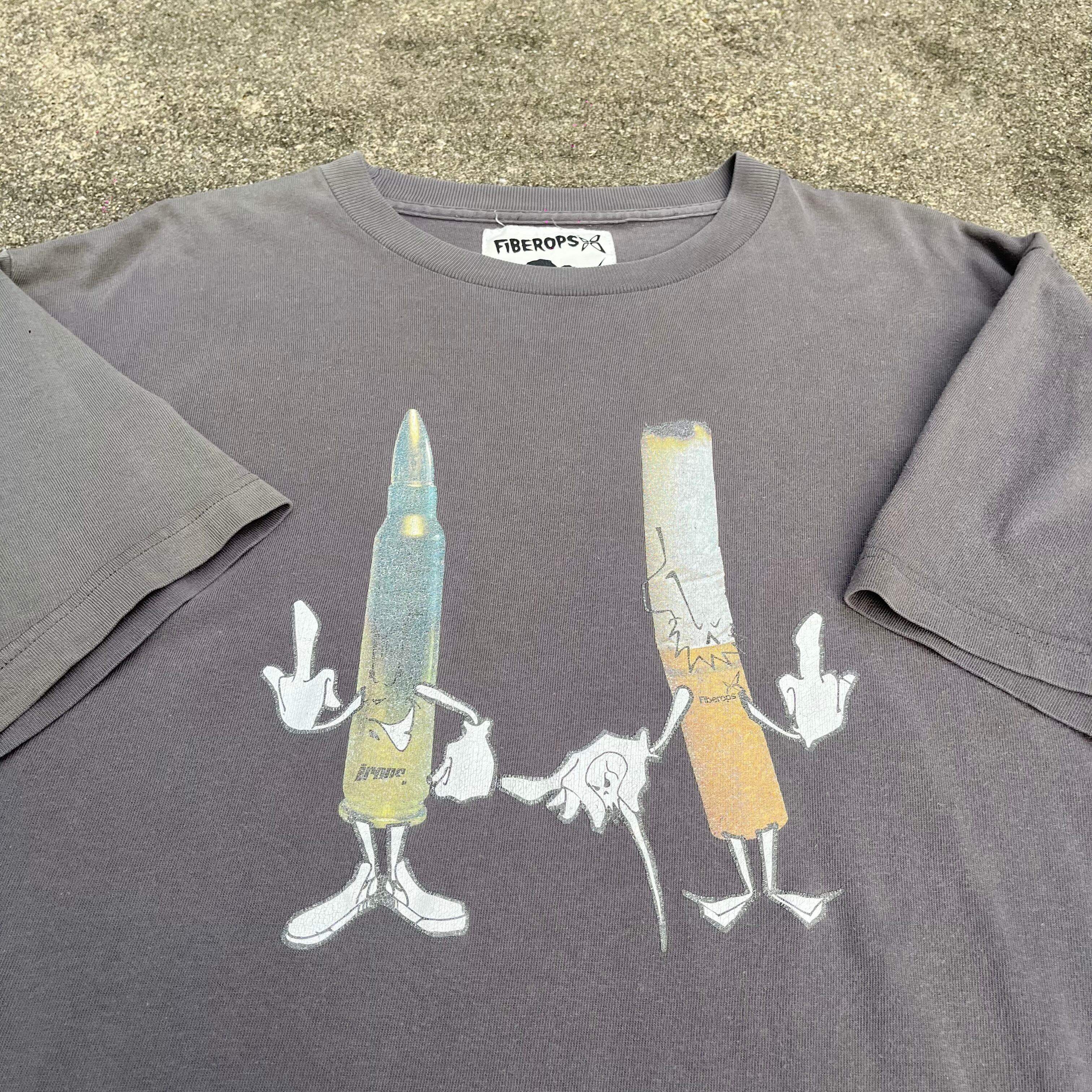 極めて褪せた濃いめのグレーのボディには、中指を立てたタバコと弾丸。