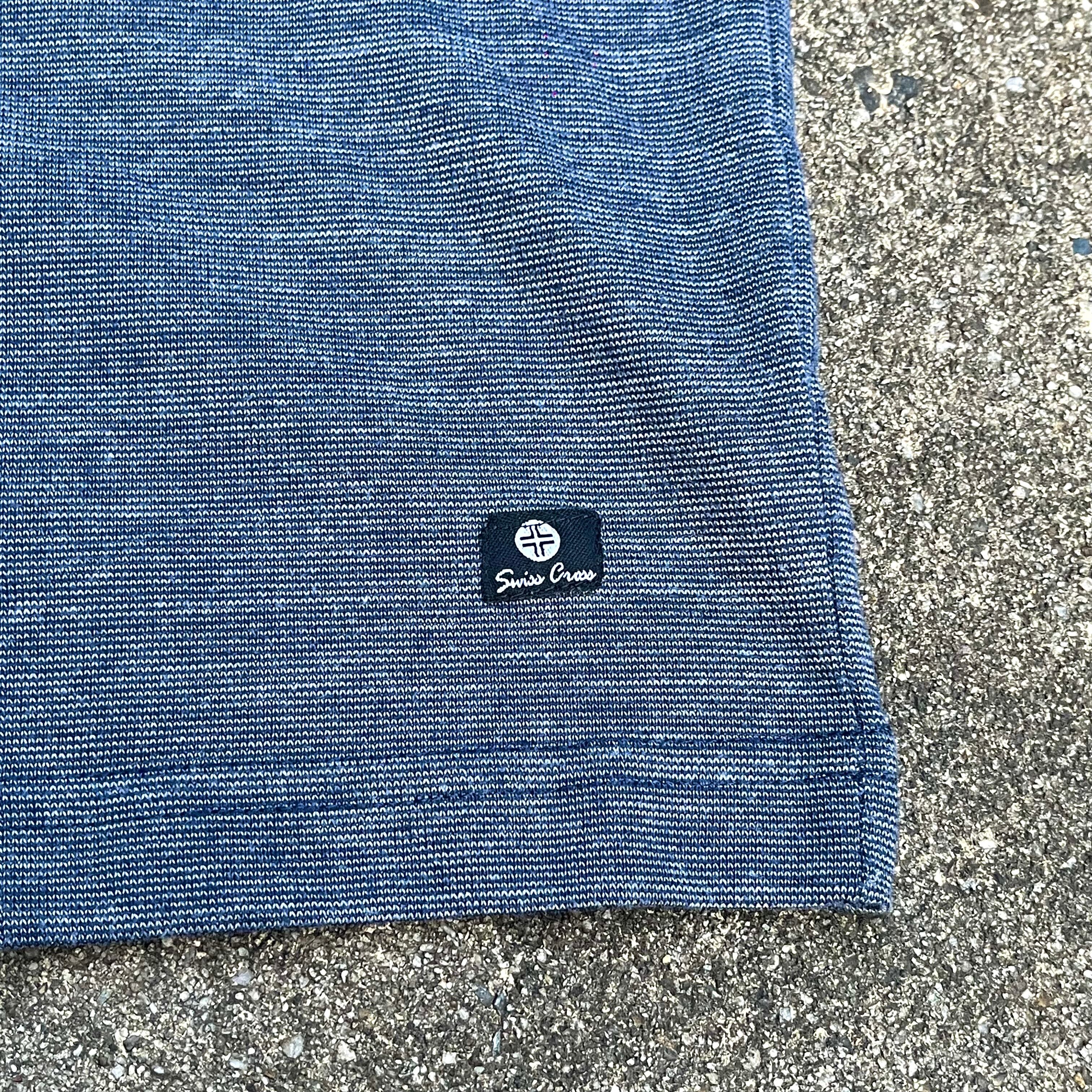 左胸のポケットやネイビーのシャンブレーのボディ。