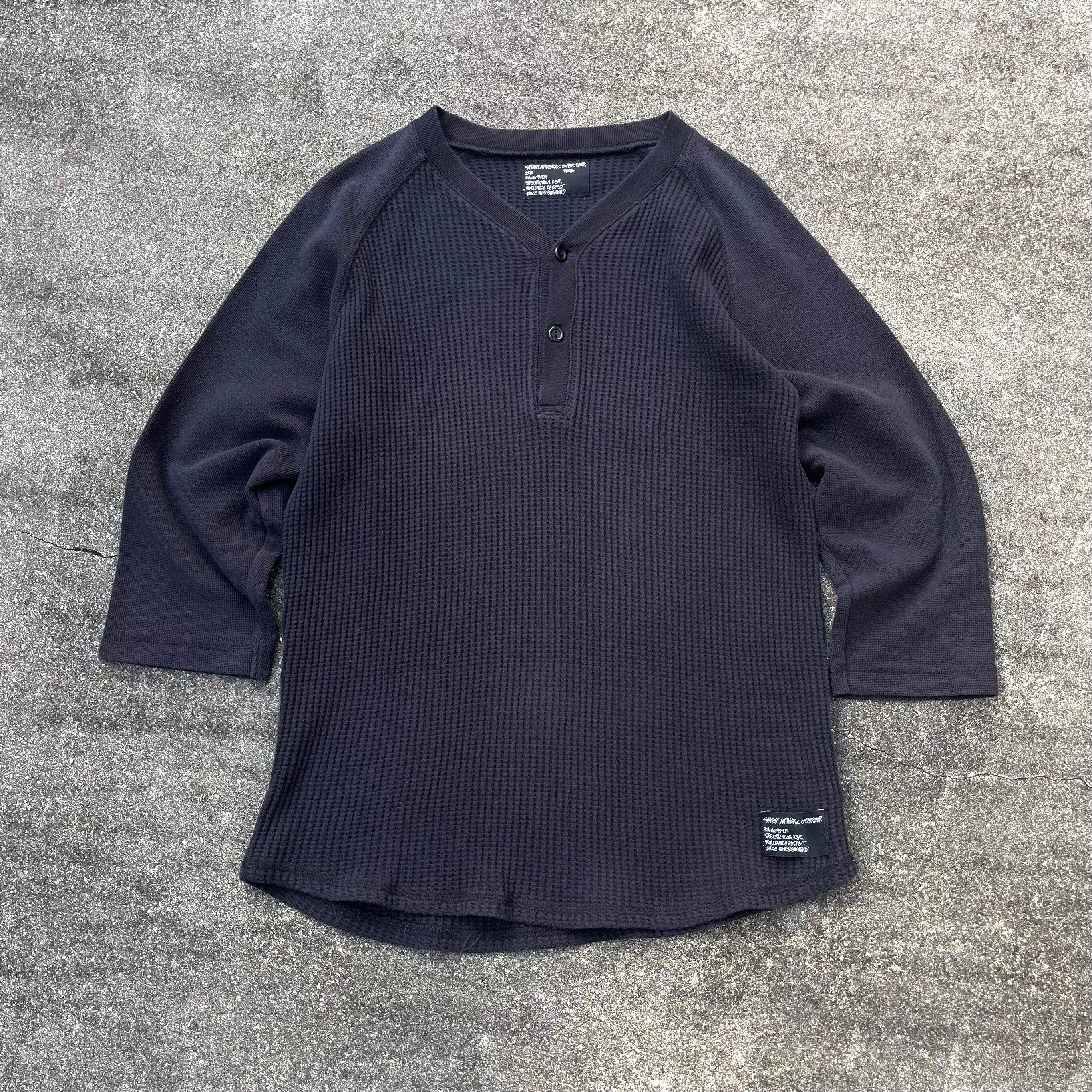 ラグランスリーブ、ヘンリーネックのサーマルTシャツ。