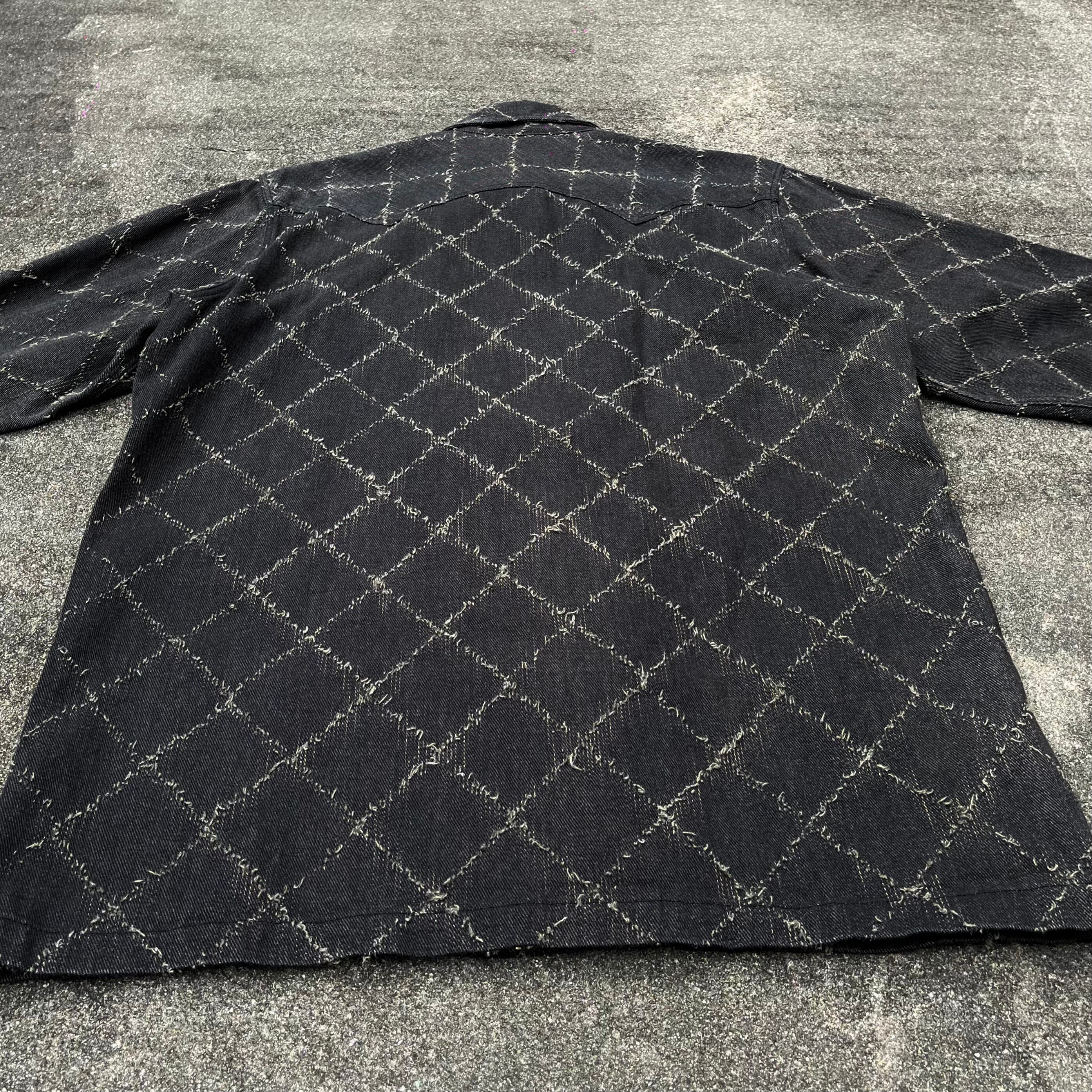 しかし、ショルダーやバックのヨーク、3連の袖のパールスナップボタンなどの野暮ったさを相殺する薄手のブラックデニムに計算されたほつれのチェックデザイン。