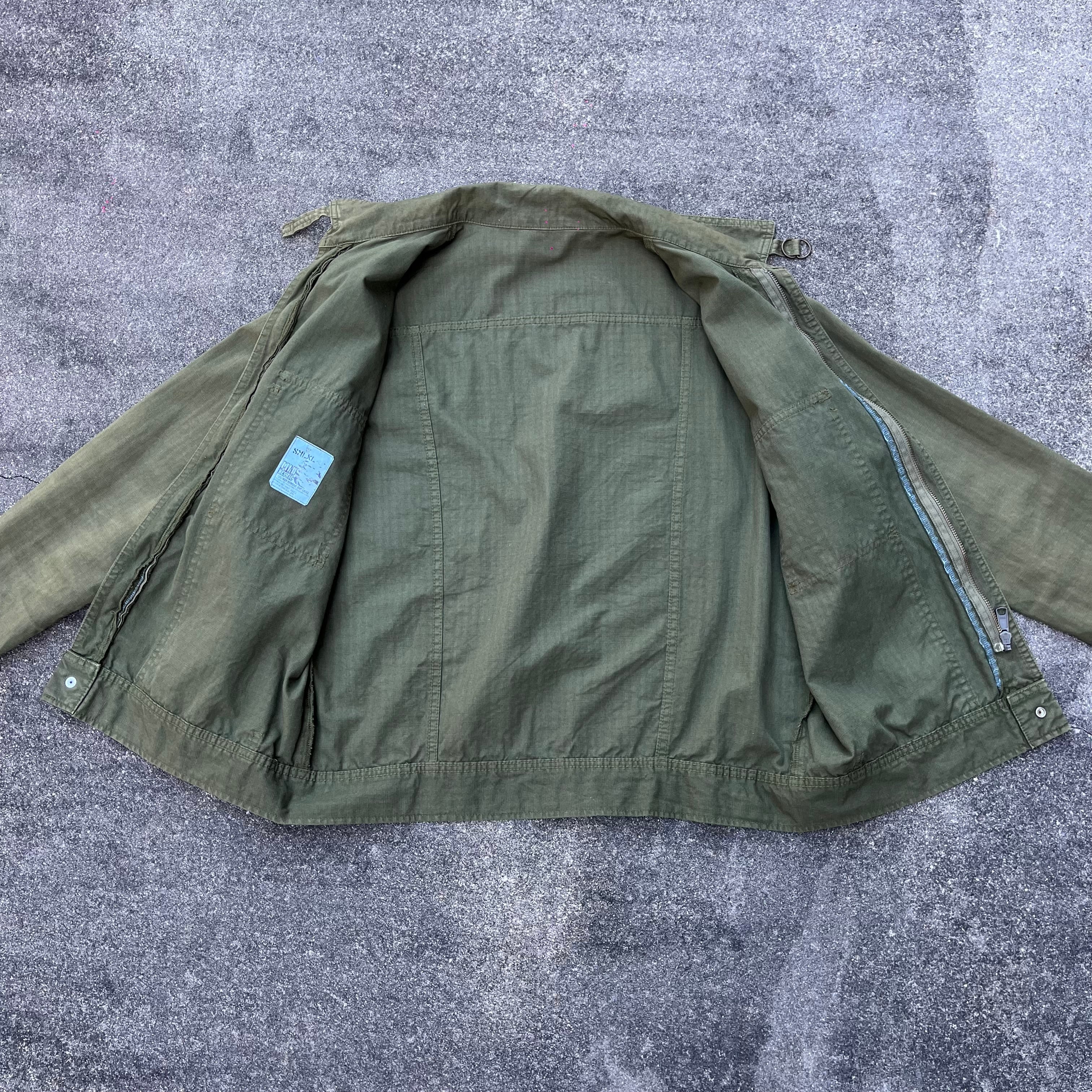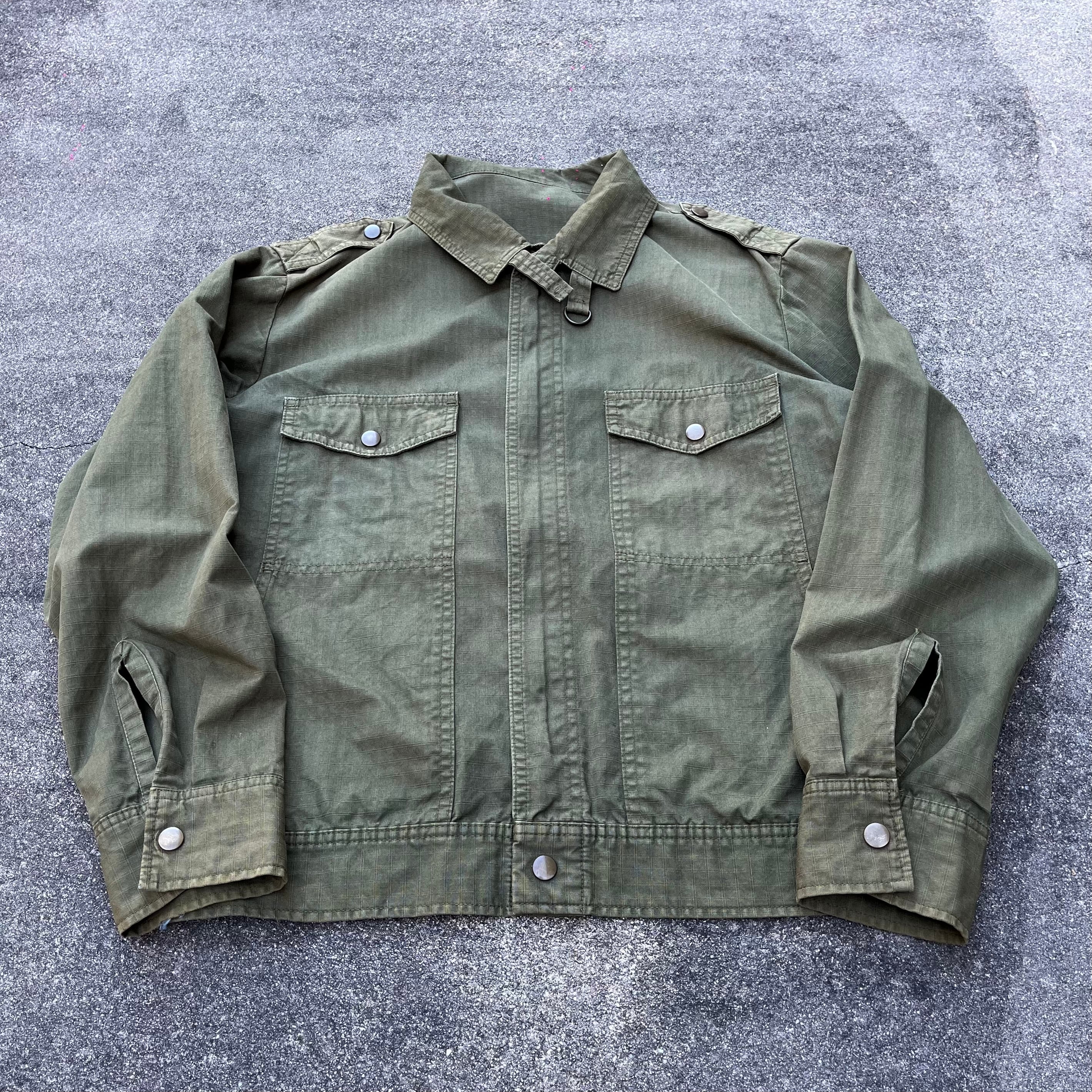 オリーブのリップストップ生地、チンストラップやジップアップのフロントなどからもベースは米軍のユーティリティシャツと思いきや、デニムジャケットのようなシルエットや背中の縫製、カーハートのハンティングジャケットのような生地の繋がった胸ポケットとサイドポケットや、短めの着丈、長め太めの袖が魅力的なこの一着。